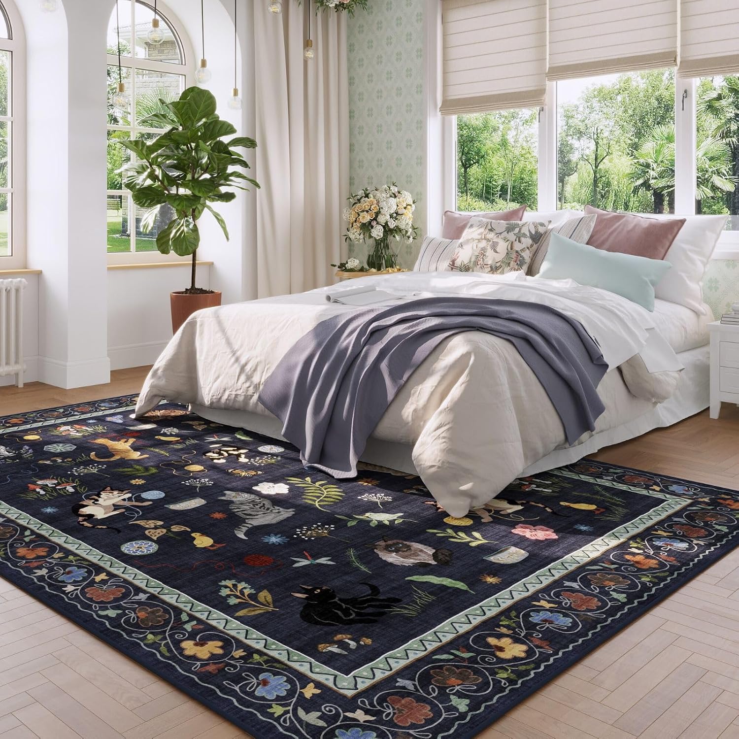 Rugcomf Living Room Rug 5x7 Rug Machine Washable Boho Area Rug Non Slip Floral Animal Cat Vintage Low Pile Large Rugs for Living Room Bedroom Farmhouse Dining Room Kids Playroom, Cobalt Blue