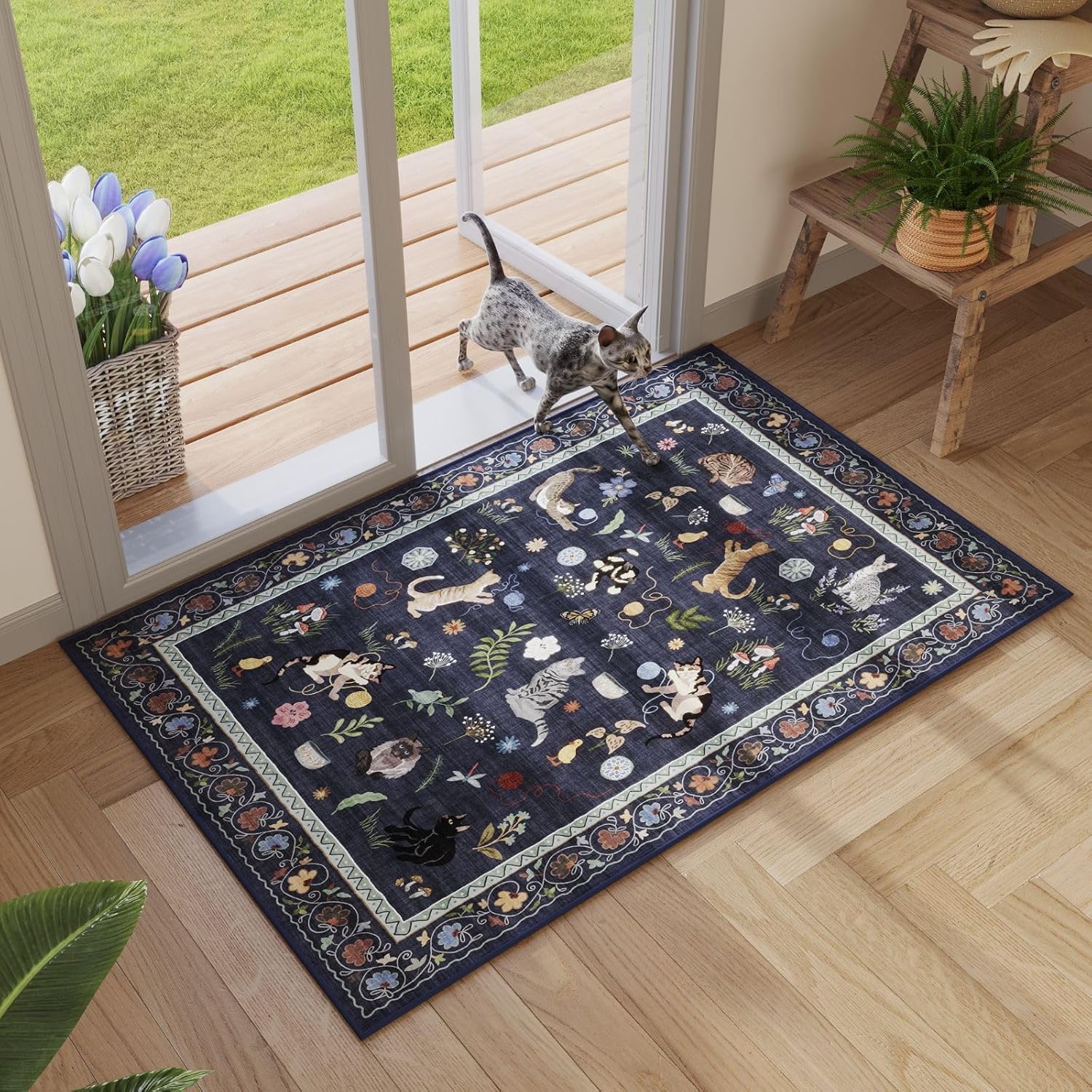Rugcomf Door Mat Indoor Entrance 2x3 Rug Machine Washable Boho Floral Animal Cat Small Area Rug Non-Slip Low Pile Throw Rugs for Entryway Kitchen Front Door Entry Kids Room, Cobalt Blue