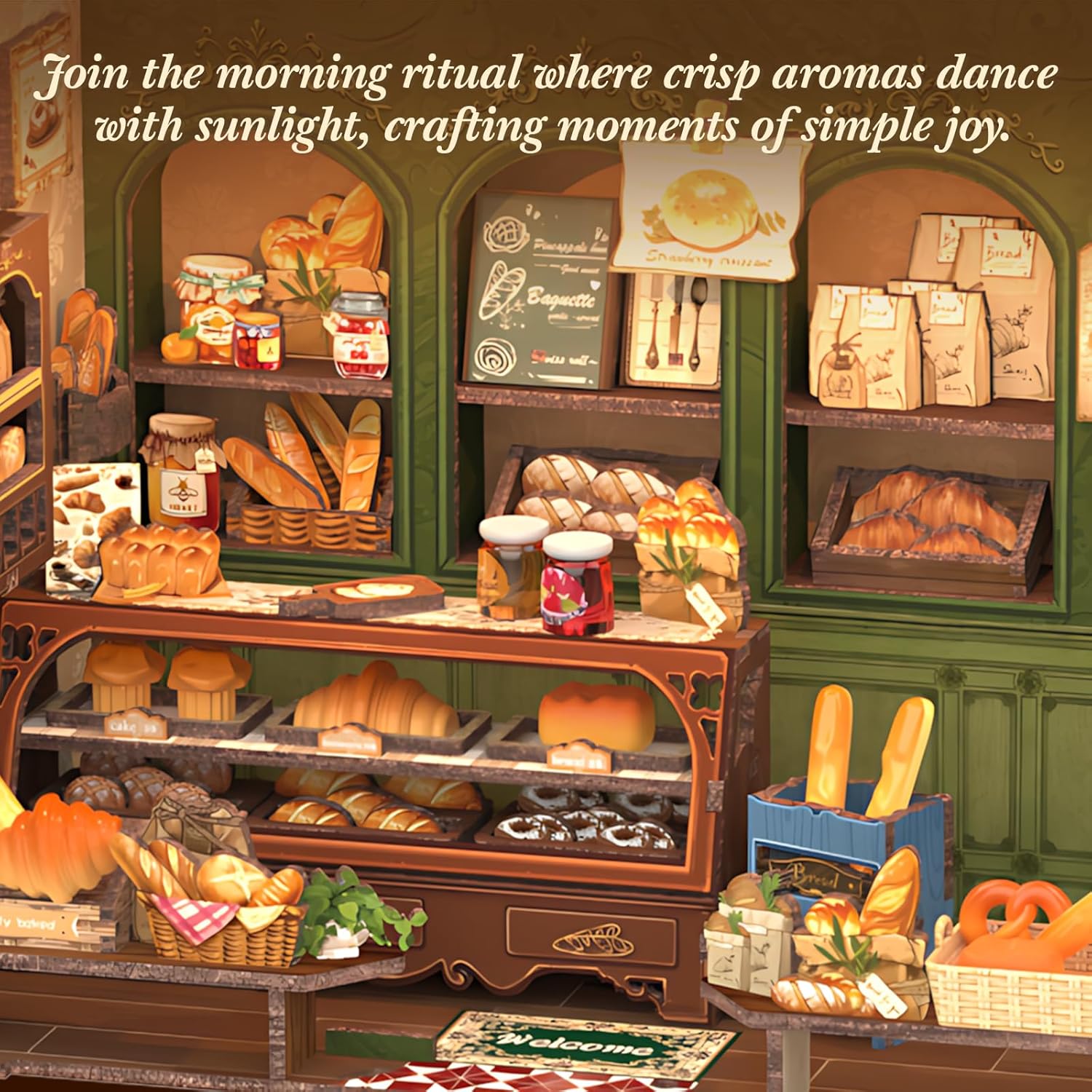 - 【Mrs.Hunt Bakery Max Book Nook Kit】Bring cozy bakery magic home with this miniature house kit! The air smells of fresh bread, where Mrs. Hunter’s Bakery stands beside quaint shops. Each morning, she bakes fragrant baguettes and fluffy European breads with care. More than food, they’re a warm gesture. Assemble this dollhouse kit for instant relaxation—capturing lazy, fragrant afternoons!