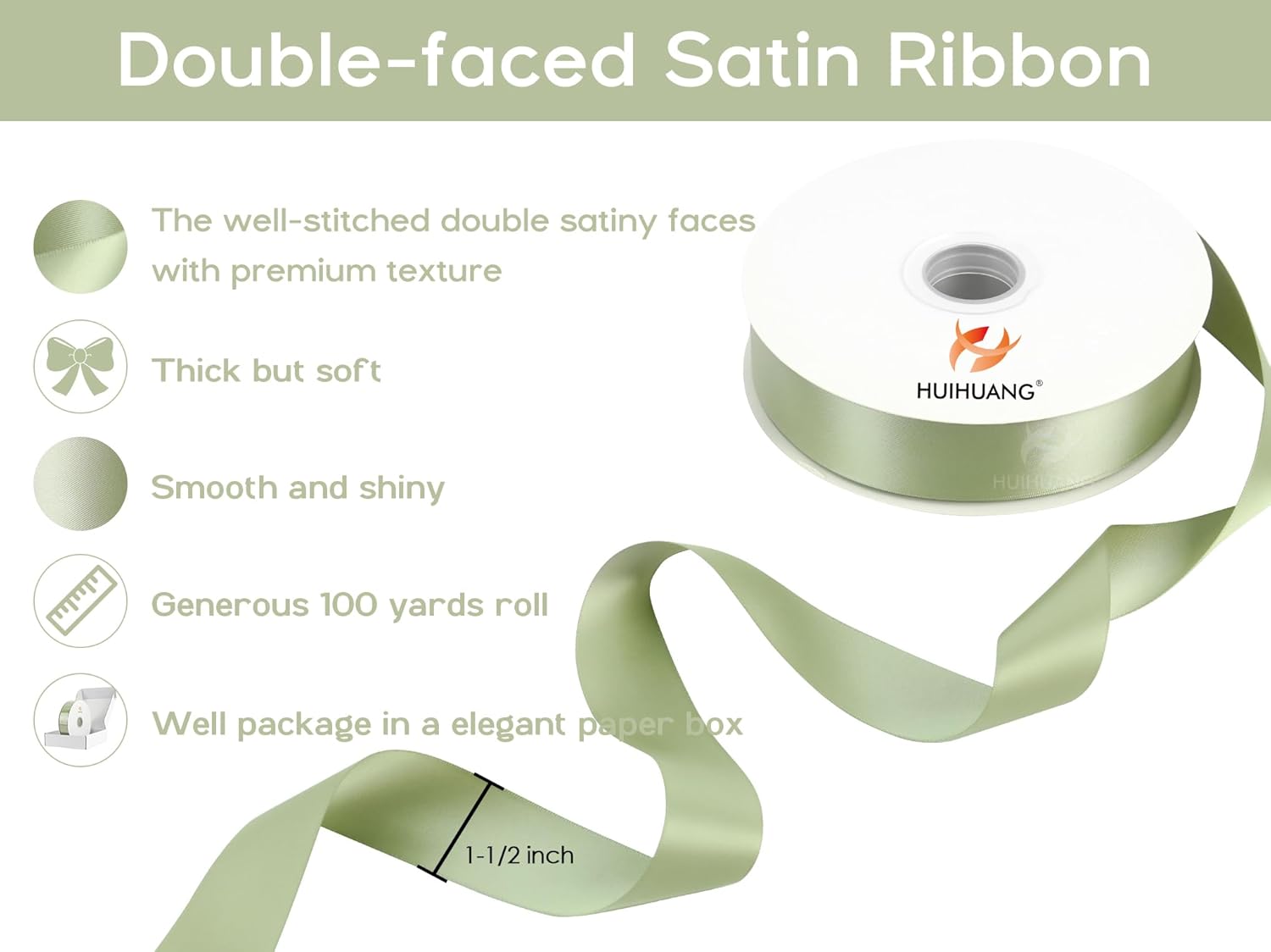 HUIHUANG Sage Green Satin Ribbon 1-1/2 inch x 100 Yards Green Double-Faced Satin Ribbon for Flower Bouquet, Gift Wrapping, Eternal Roses, DIY Crafts, Bridal Shower Wedding Decor