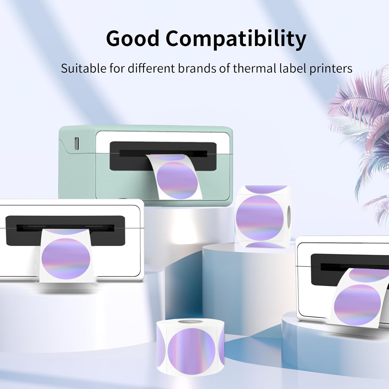 - Package: Circle Holographic Purple Thermal Sticker Labels 1.5", 350 Labels/Roll. It’s printable with a thermal printer, No ink toner or ribbons are needed