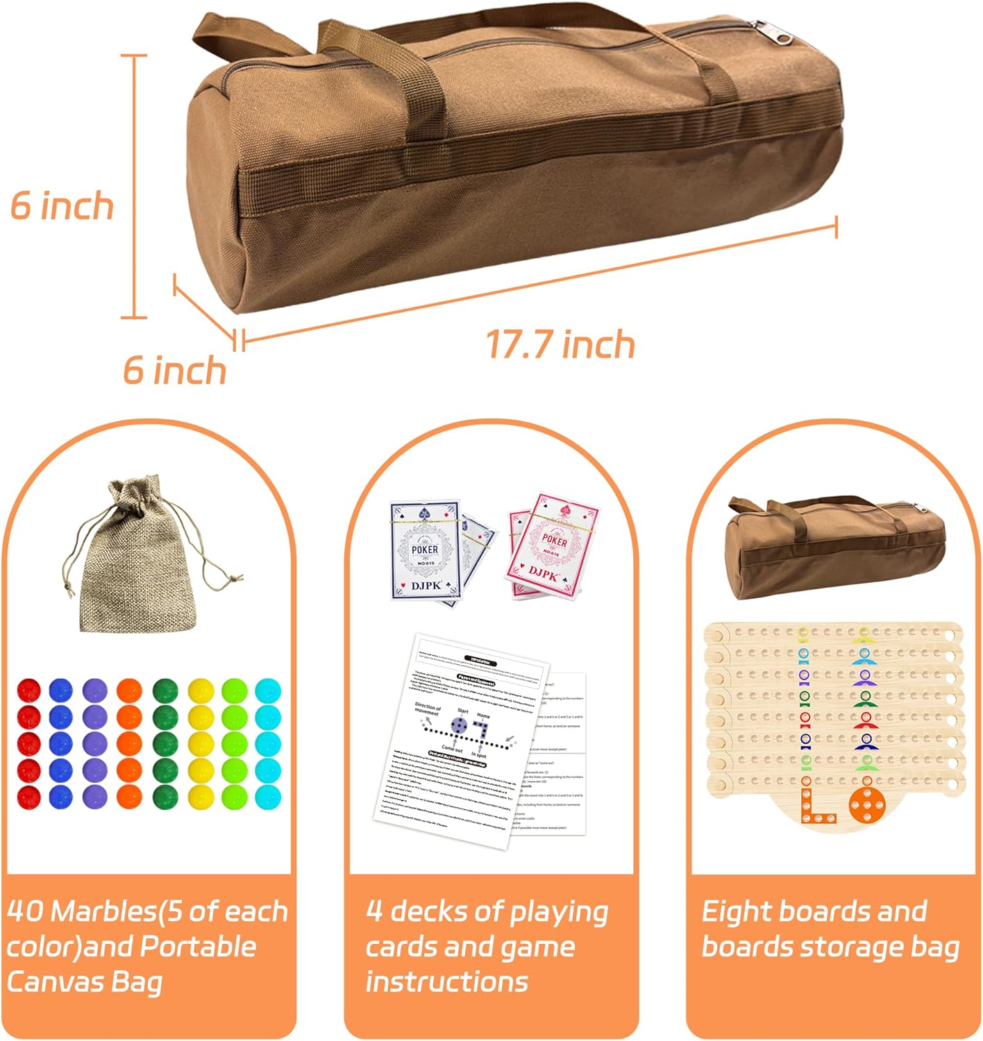 - **Fun Gameplay & Easy Assembly**: Ideal for 2-8 players, this game features rich colors for easy player identification. The set includes 8 interlocking solid wood (pine) game boards, each measuring approximately 14.17x4.7x0.6 inches, 4 decks of playing cards, 40 colorful marbles, 1 portable canvas bag, and detailed game instructions. The boards are designed to fit together easily without moving around, ensuring a stable setup.