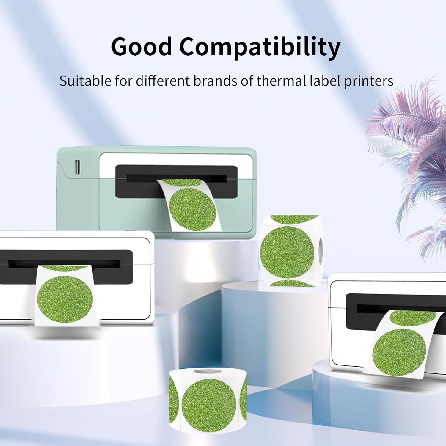 - Package: Circle Holographic Glitter Green Thermal Sticker Labels 1.5", 350 Labels/Roll. It’s printable with a thermal printer, No ink toner or ribbons are needed