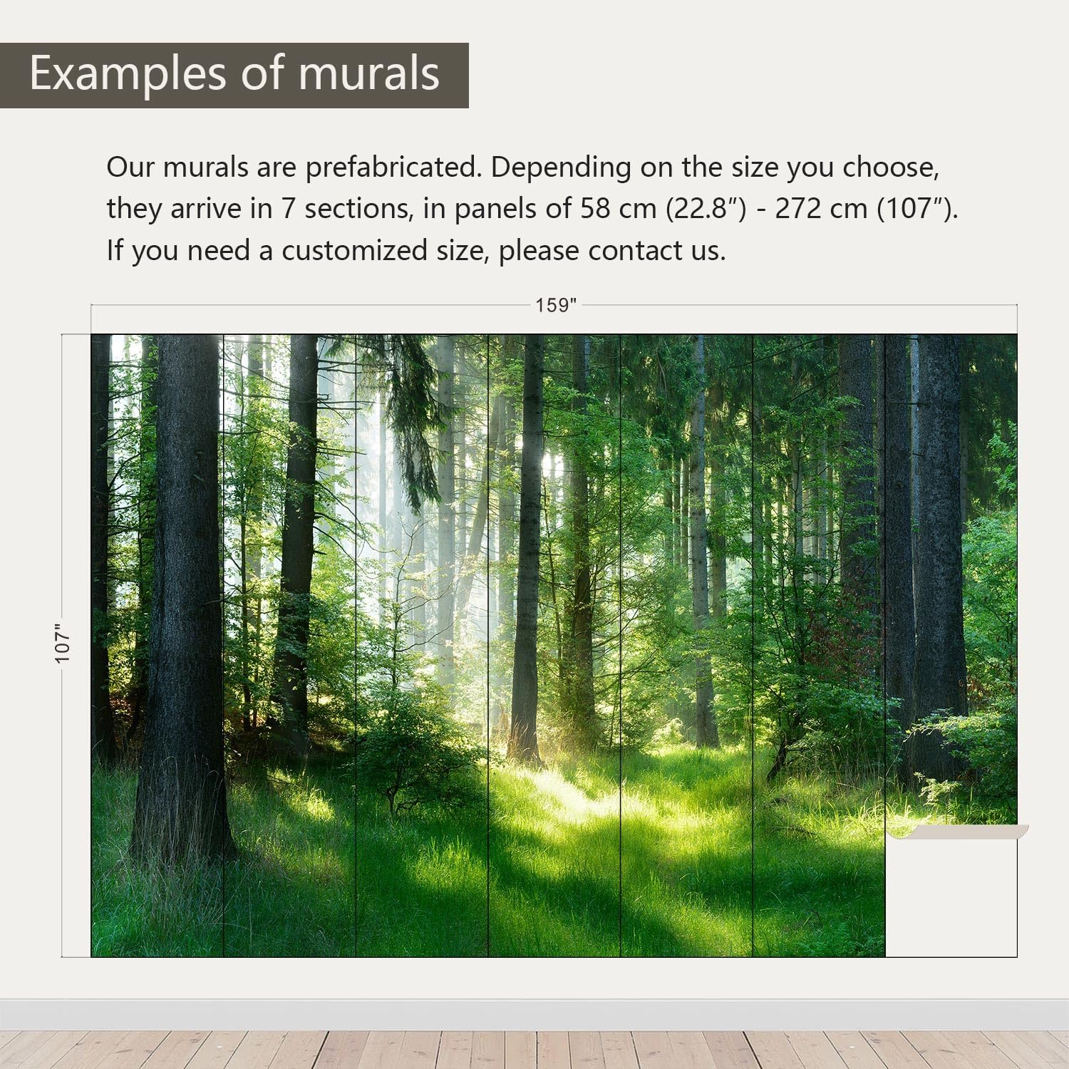 - Size note: Mural measures 159"W x 107"H and is divided into 7 sections, each section is labeled with a number underneath, eliminating the need to overlap patterns when installing.