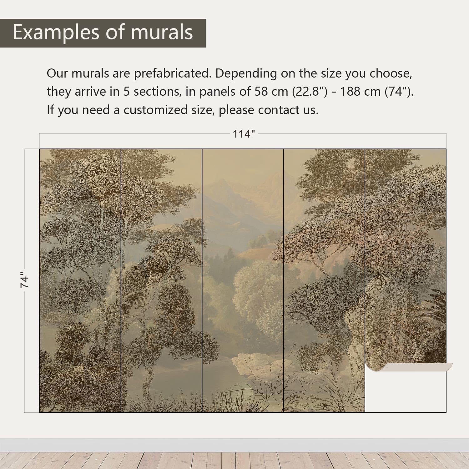 - Size note: Mural measures 114"W x 74"H and is divided into 5 sections, each section is labeled with a number underneath, eliminating the need to overlap patterns when installing.