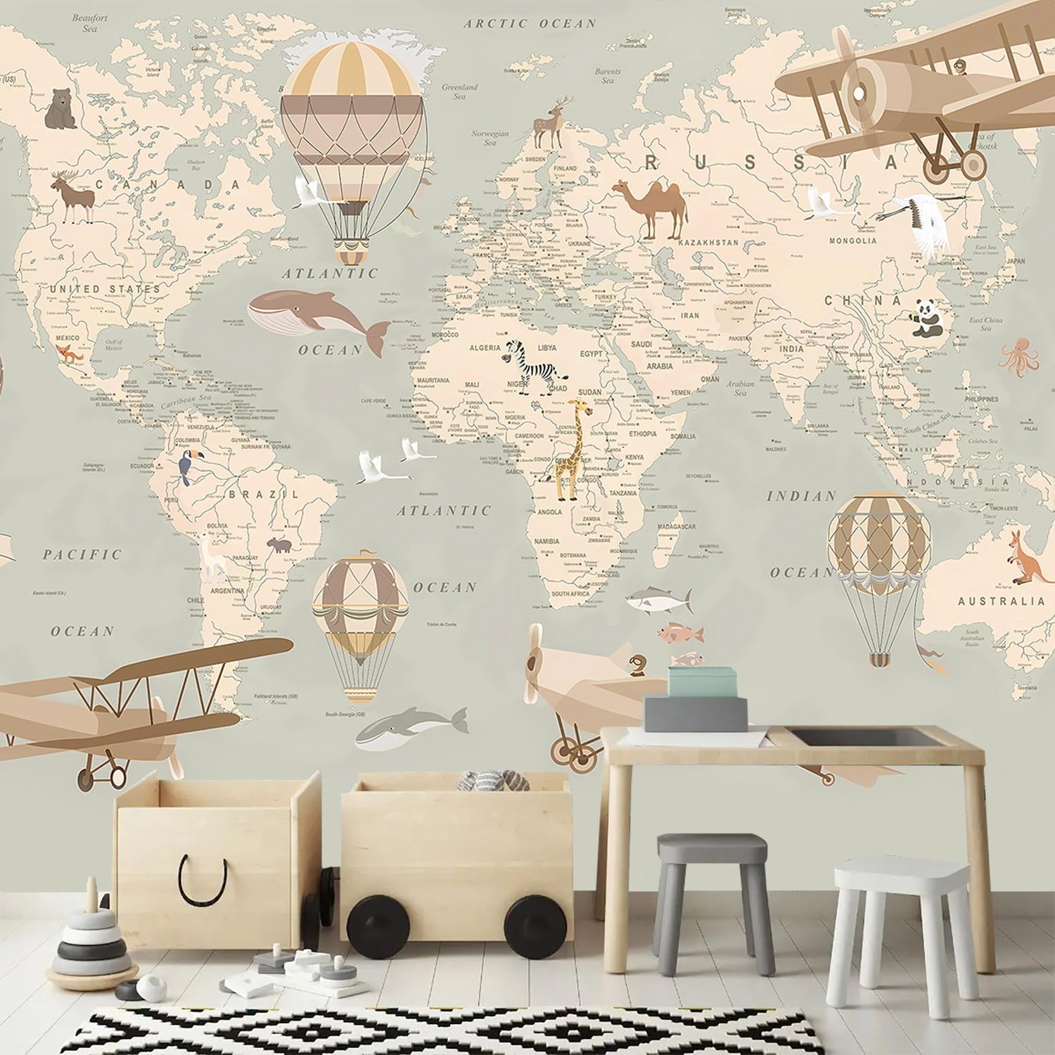 AFZEVEB-Vintage Animal Wallpaper Cartoon Aircraft Map Wall murals for Kids Room 136"x96"(Not Peel and Stick)