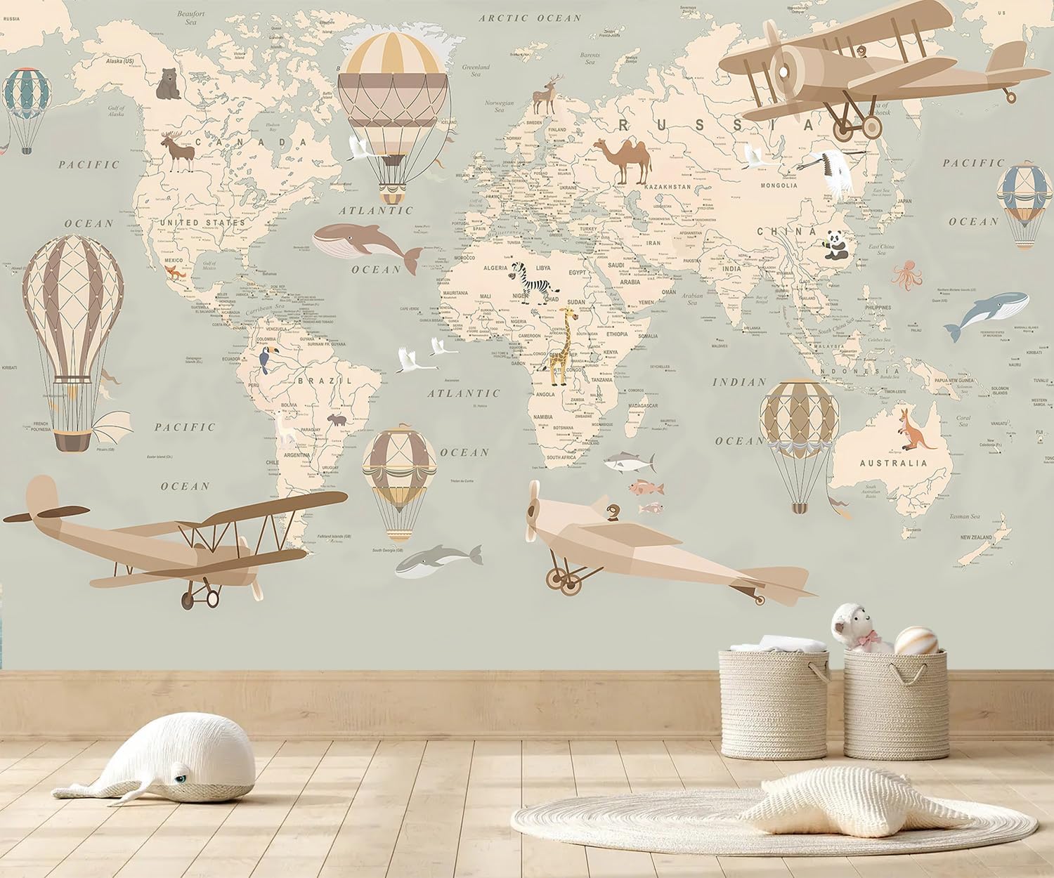 AFZEVEB-Vintage Animal Wallpaper Cartoon Aircraft Map Wall murals for Kids Room 159"x107"(Not Peel and Stick)