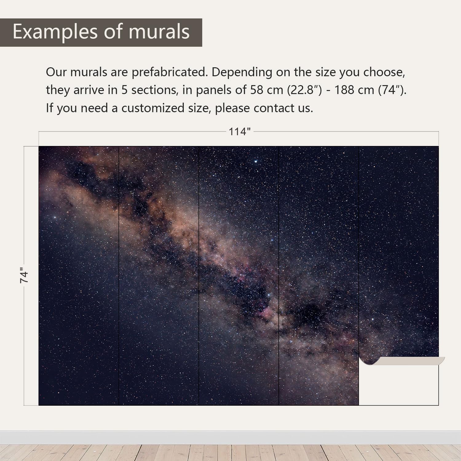- Size note: Mural measures 114"W x 74"H and is divided into 5 sections, each section is labeled with a number underneath, eliminating the need to overlap patterns when installing.