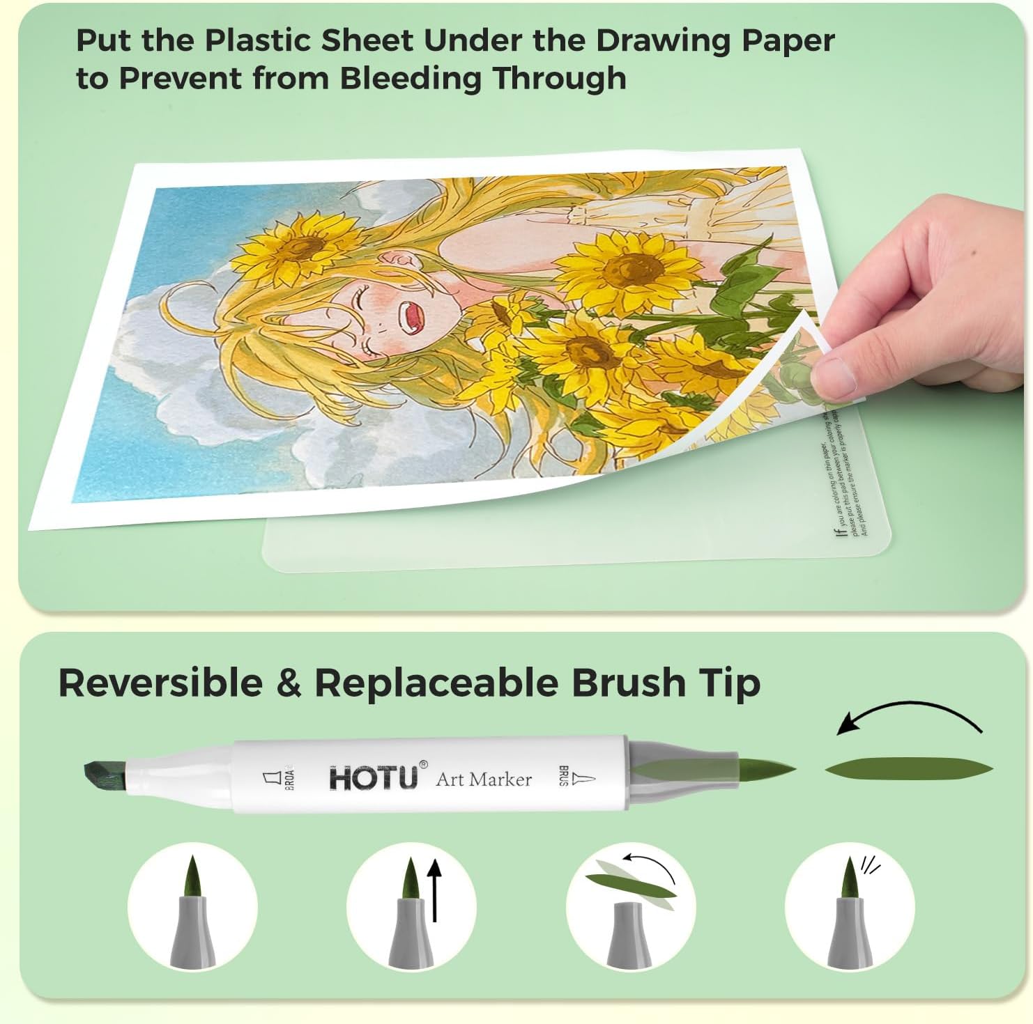 - SEAMLESSLY BLENDING: HOTU brush tip alcohol markers deliver seamless, grain-free color transitions with premium alcohol-based ink that flows uniformly for buttery-smooth gradients .You can ceate beautiful professional artworks with HOTU alcohol based markers,suitable for beginners, art enthusiasts and artists.Quick-drying formula locks colors in seconds, and Say goodbye to ink-stained tables!Anti-bleed pad preventing smudges so your artwork stays clean,crisp smudge-free