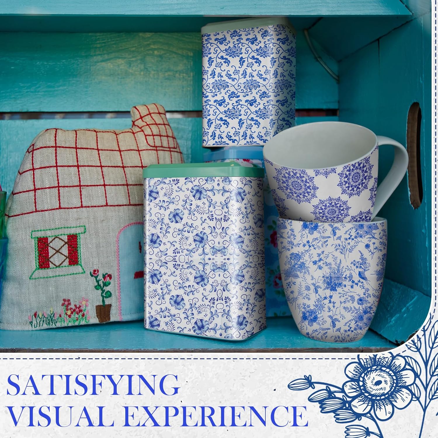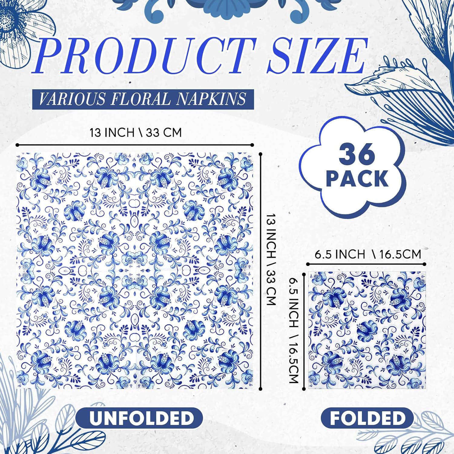 - Detailed Realistic Prints: these collage napkins are decorated with various floral designs, all in blue porcelain style; The fluid, realistic prints enhance their sophistication, making them ideal for decorating a variety of items