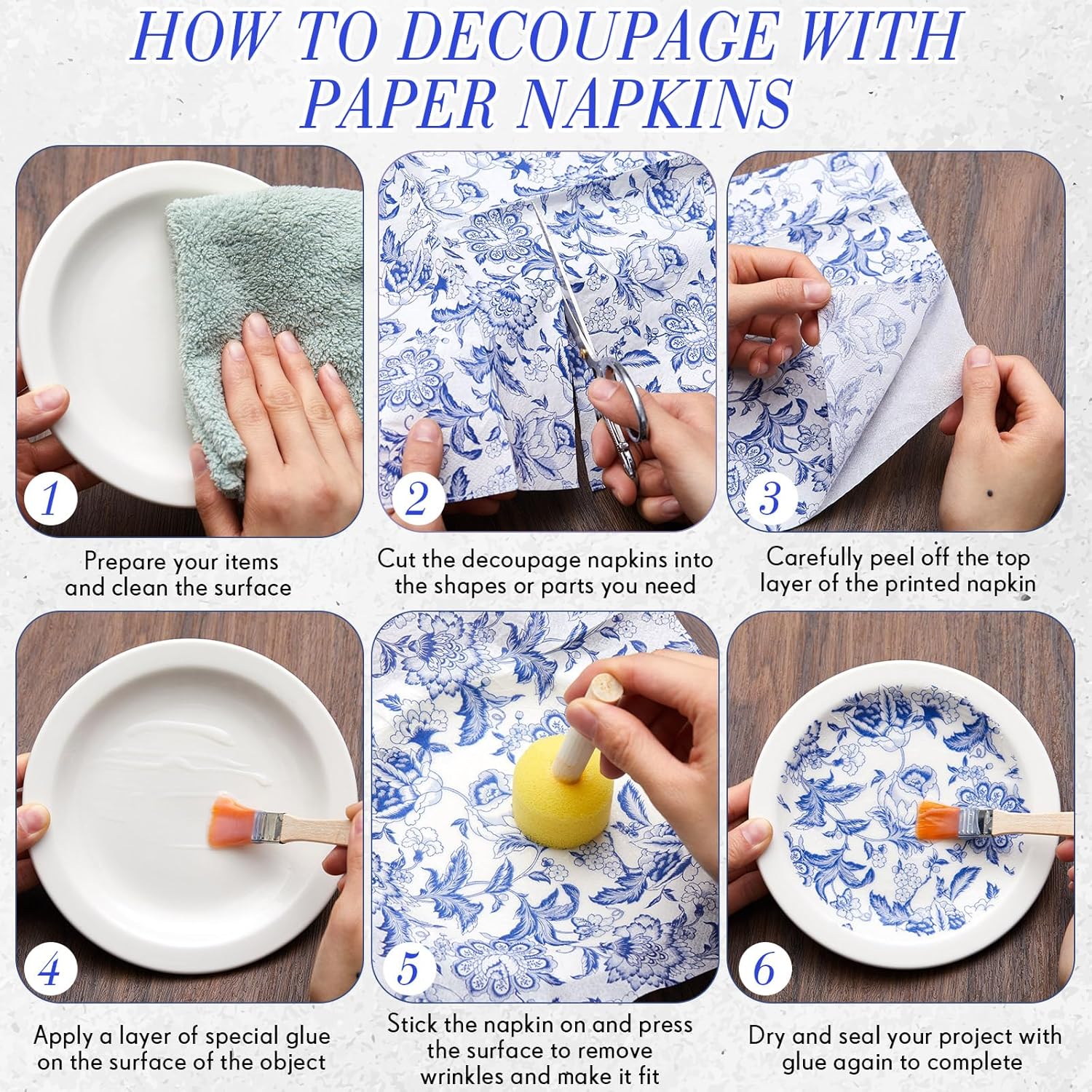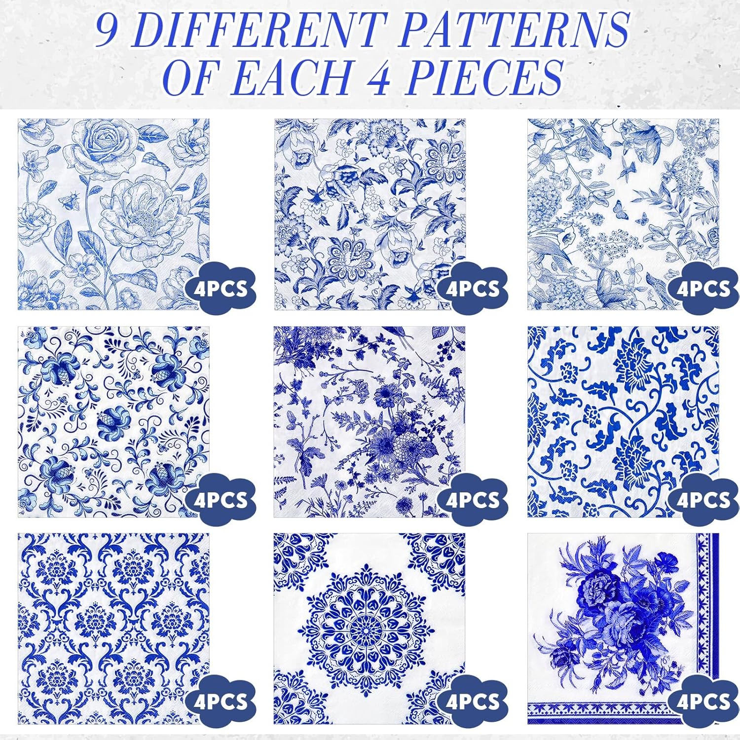 - Colorful Beauty: in this collection, you will find 9 different blue white floral decoupage napkin decorations, 4 of each, a total of 36 napkins; Providing you with ample choices to replace and change as needed