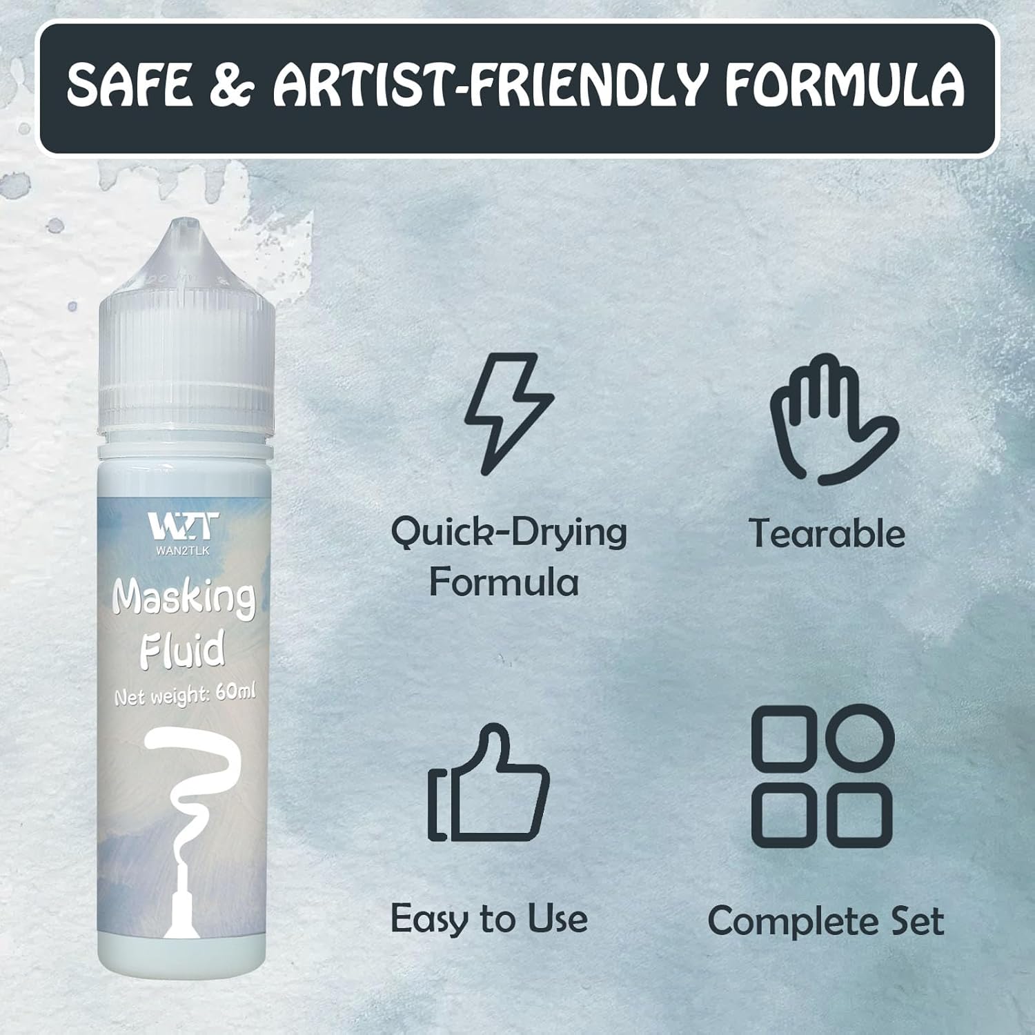 - Complete Set: Our watercolor masking fluid set includes 60ml of masking fluid, two brushes, and an eraser. These brushes are perfect for applying masking fluid to watercolors, and the set is complete and ready to use