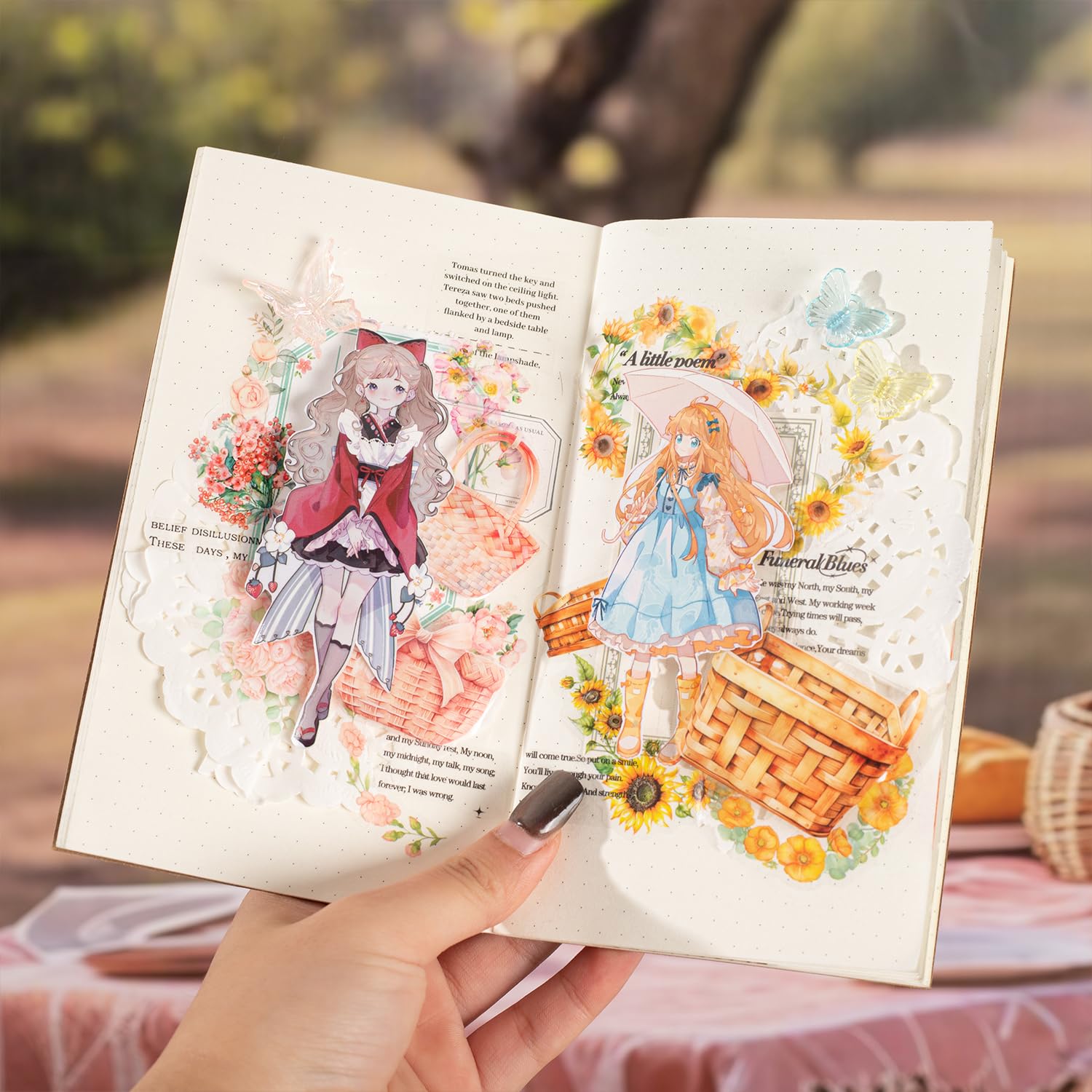 Flower Basket PET Tape Set, 6 Rolls Pre-Cut Vintage Floral Scrapbook Supplies for Journaling, DIY Crafts, and Planners,with Clip