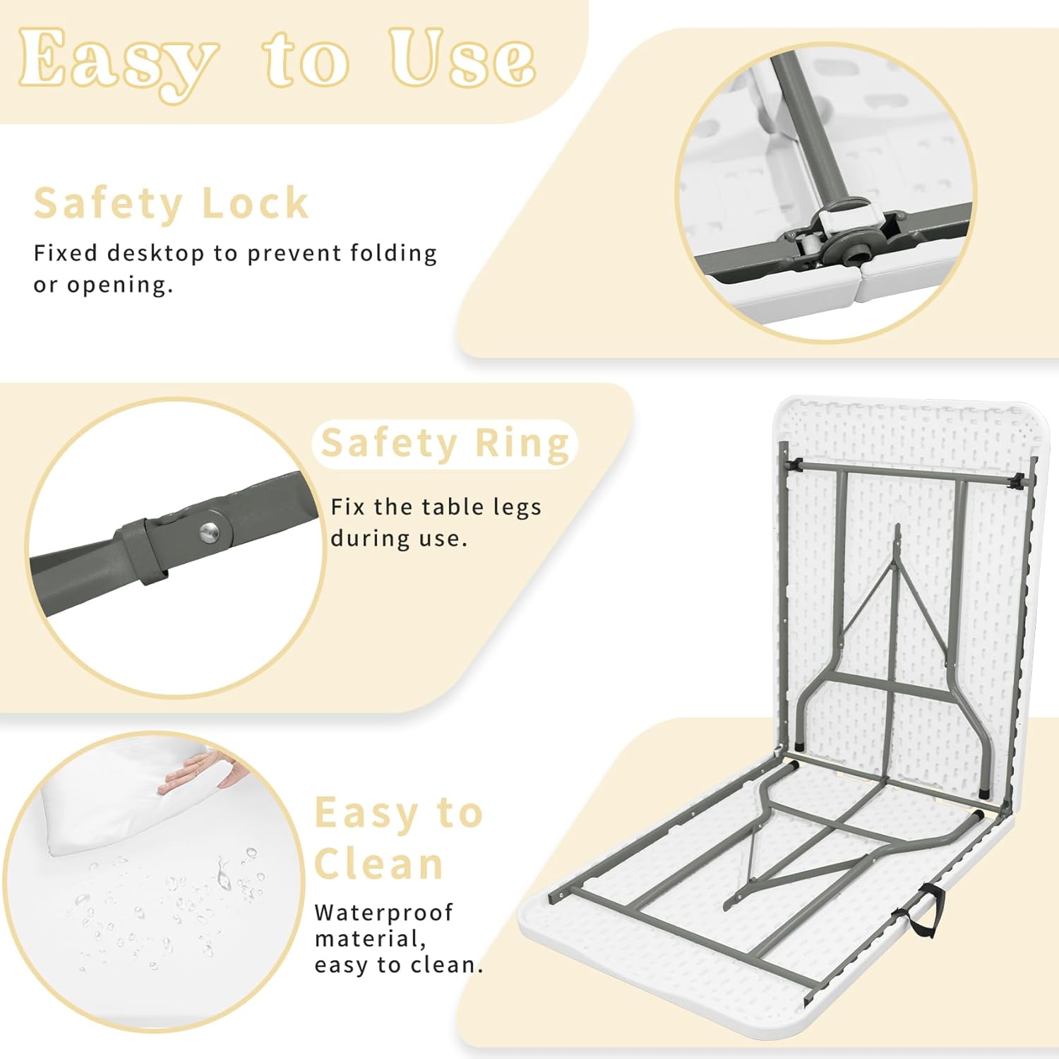 - Multi Functional Outdoor Table๏ผThe surface of this folding table is smooth and sturdy, easy to wipe, and the table corners are designed with rounded corners for safety and reliability. The anti slip covers on the four table legs prevent the table from shaking freely and protect the floor from scratches. Each table can accommodate 4-8 people, making it the best choice for outdoor camping, indoor activities, picnics, offices, birthday parties, banquets, weddings, craft fairs, kitchen table, and other events.