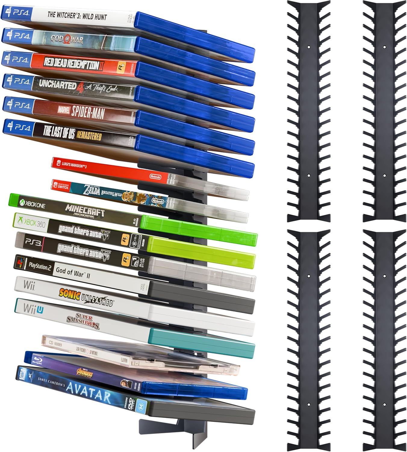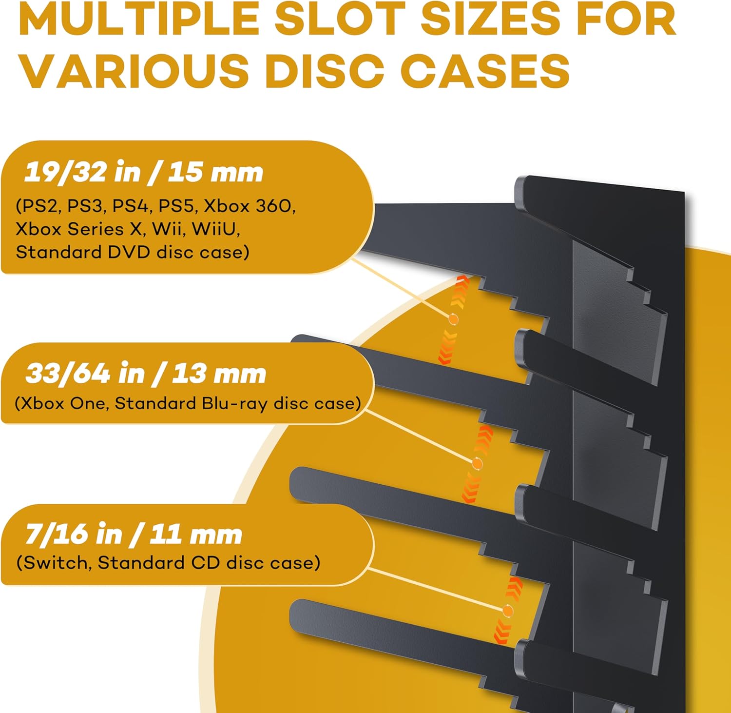 - Versatile Compatibility: Designed with three slot sizes, this video game storage holder accommodates various disc cases, including 7/16 in (11mm) for original Switch and standard CDs, 33/64 in (13mm) for Xbox One and standard Blu-ray discs, and 19/32 in (15mm) for PS2, PS3, PS4, PS5, Xbox 360, Xbox Series X, and standard DVDs. This all-in-one solution keeps your entertainment collection neatly organized. (Please refer to size specifications for additional compatibility.)