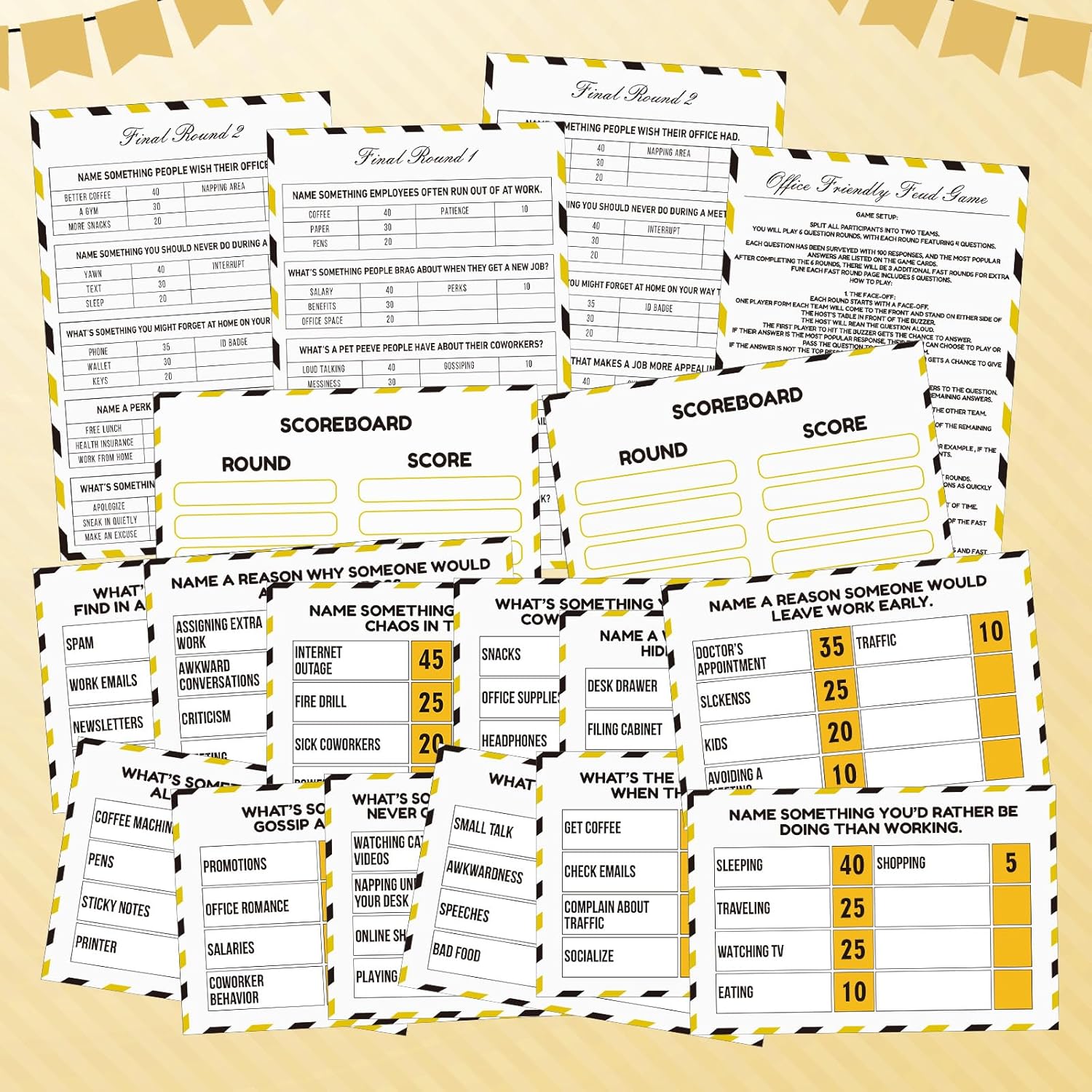 - Office Party Friendly Feud Game Set: enjoy a lively trivia night with our complete set, includes 1 game instruction card, 2 score cards, 24 office theme question cards and 3 quick final game cards, 30 cards in total for non-stop fun