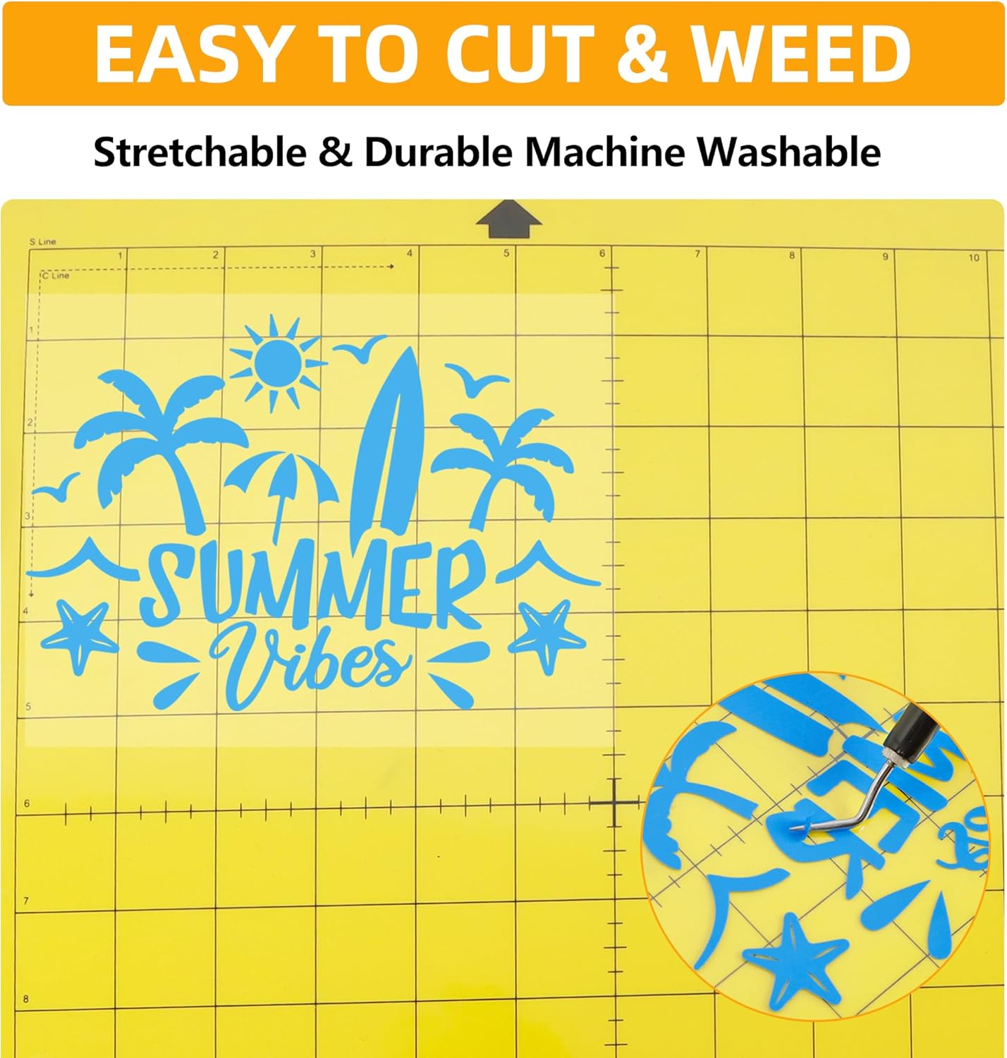 - EASY TO CUT & WEED & TRANSFER: Our htv vinyl is sensitive to temperature and pressure, which can be quickly and easily to weed and peel. It is compatible with all cutter machines, most heat presses and household irons on the market, and perfect for 12x12" and 12x24" cutting mats. You can easily apply adhesive backing htv to fabric using a hot iron or hot press. Please note that it is warm peel