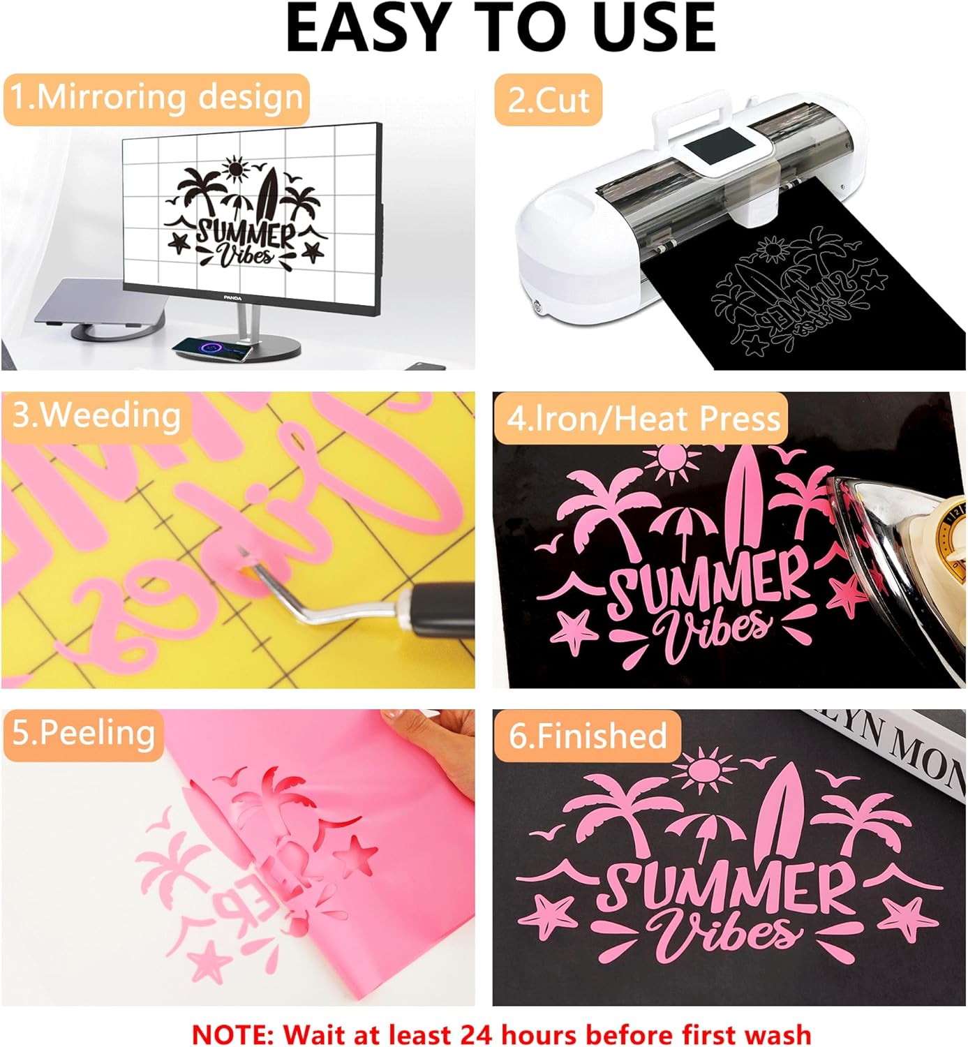- EASY TO CUT & WEED & TRANSFER: Our htv vinyl is sensitive to temperature and pressure, which can be quickly and easily to weed and peel. It is compatible with all cutter machines, most heat presses and household irons on the market, and perfect for 12x12" and 12x24" cutting mats. You can easily apply adhesive backing htv to fabric using a hot iron or hot press. Please note that it is warm peel