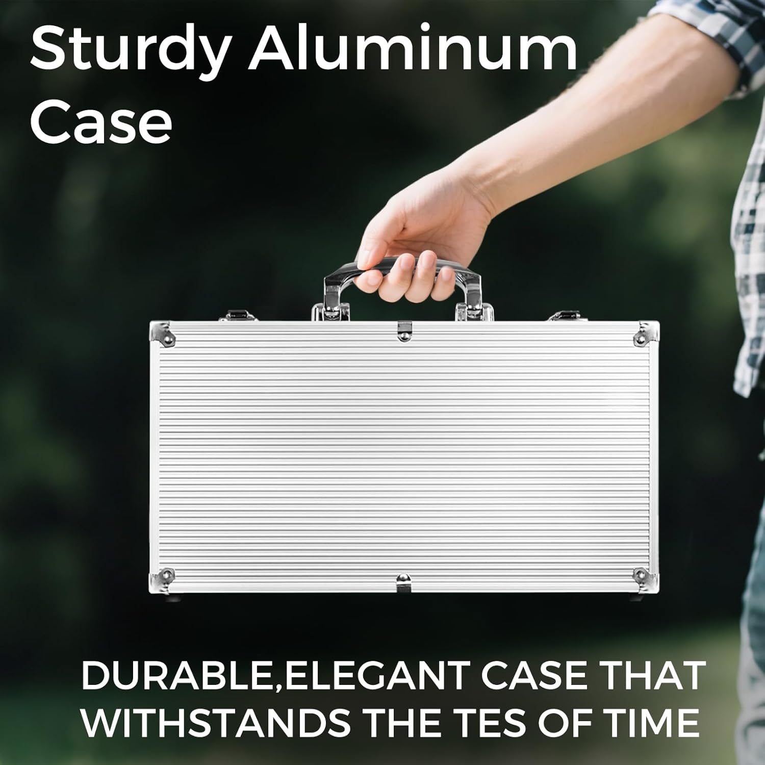 - Portable Aluminum Case: Embrace mobility with our Premium aluminum case. Reinforced corners ensure sturdiness, while dual latches secure your Poker essentials. With compartments for organized storage and a swivel handle for convenience, this case is your Flawless Poker companion