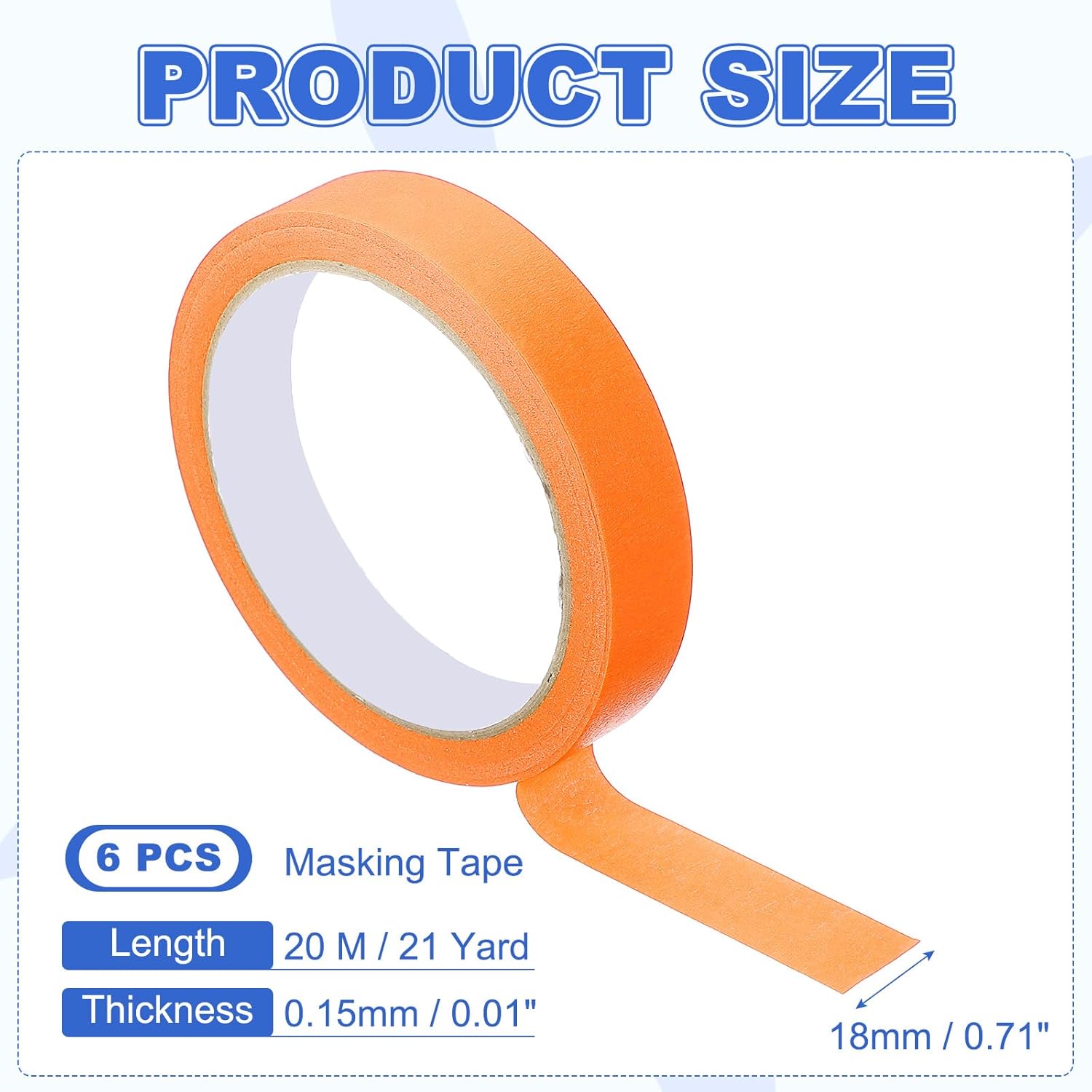 - The masking tape, provides here,is in size of: Thickness: 0.15mm(0.01inch); Size: 18mm x 20m(0.71inch x 21Yard); Color: Orange; Material: Crepe Paper In the package of: 6 Pack x Masking Tape