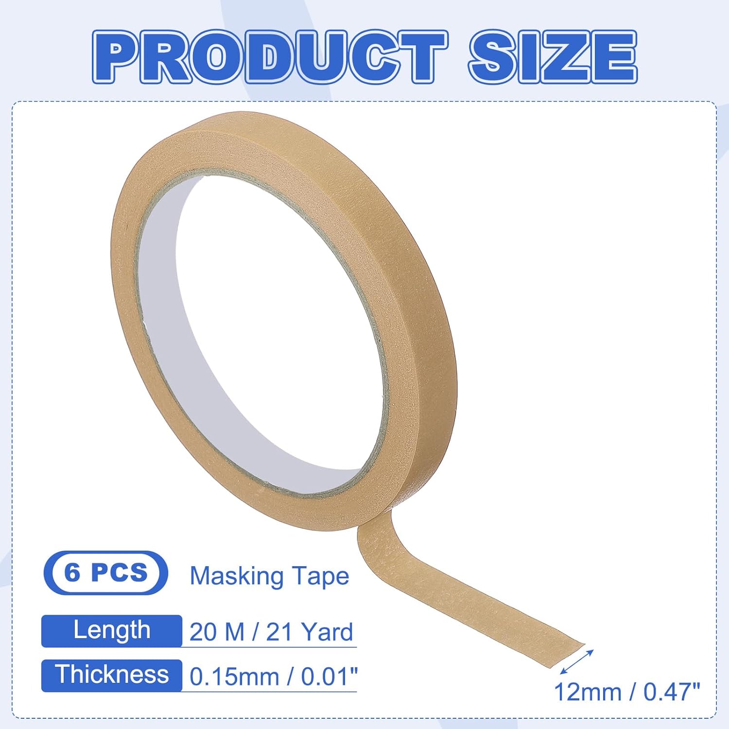 - The masking tape, provides here,is in size of: Thickness: 0.15mm(0.01inch); Size: 12mm x 20m(0.47inch x 21Yard); Color: Brown; Material: Crepe Paper In the package of: 6 Pack x Masking Tape