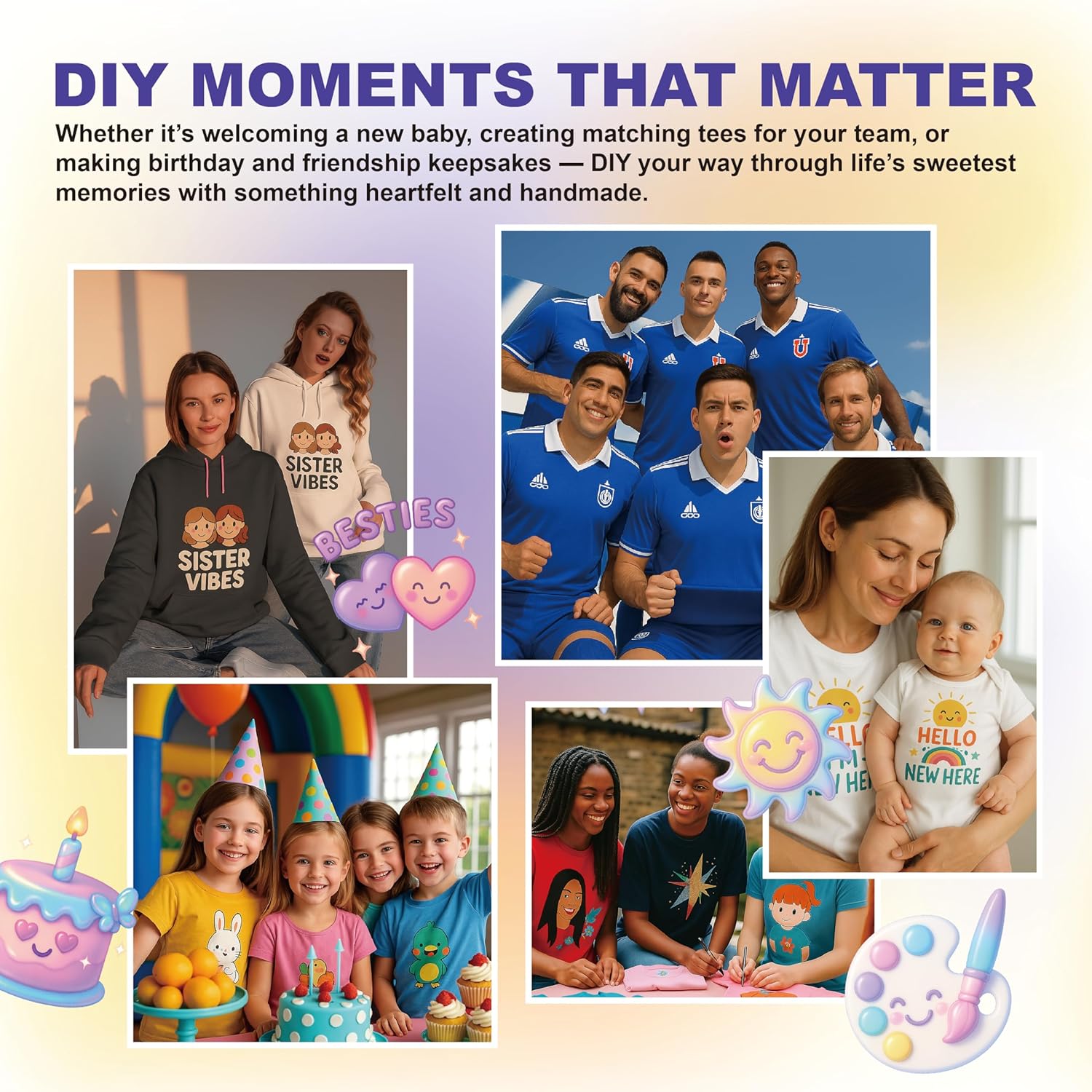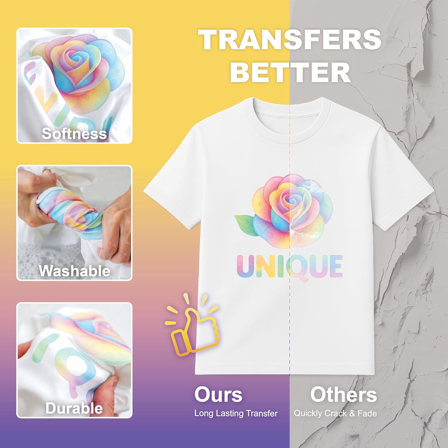 - Durable & Machine Washable –– HTVJOYDO printable heat transfer paper delivers a bright, soft finish that feels natural and lightweight on fabric. The transferred design stays vivid after repeated washes—resisting fading, cracking, or peeling – making it perfect for everyday wear or thoughtful DIY gifts. All materials are non-toxic and safe for baby clothes and family shirts.