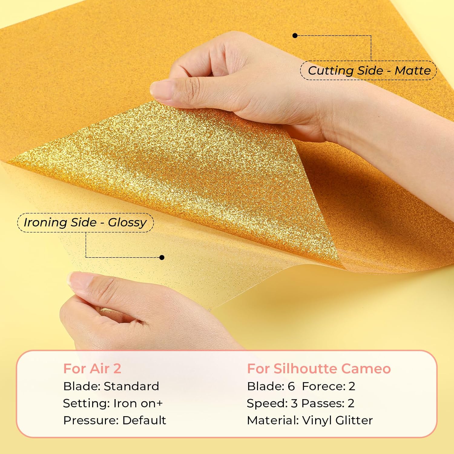 - 【SUPER EASY TO CUT & WEED& TRANSFER】Our glitter HEAT TRANSFER VINYL is thin but with an excellent cutting application feature. The matte backing is easy to distinguish the cutting side, and you can follow the instructions and set up suitable parameter with cutters, and then easy to weed and complete the complex projects with NO EXTRA TIME. Quickly and easily apply the adhesive-backed HTV to fabric using a hot iron or heat press. Please note that our glitter Vinyl Heat Transfer is COLD peel
