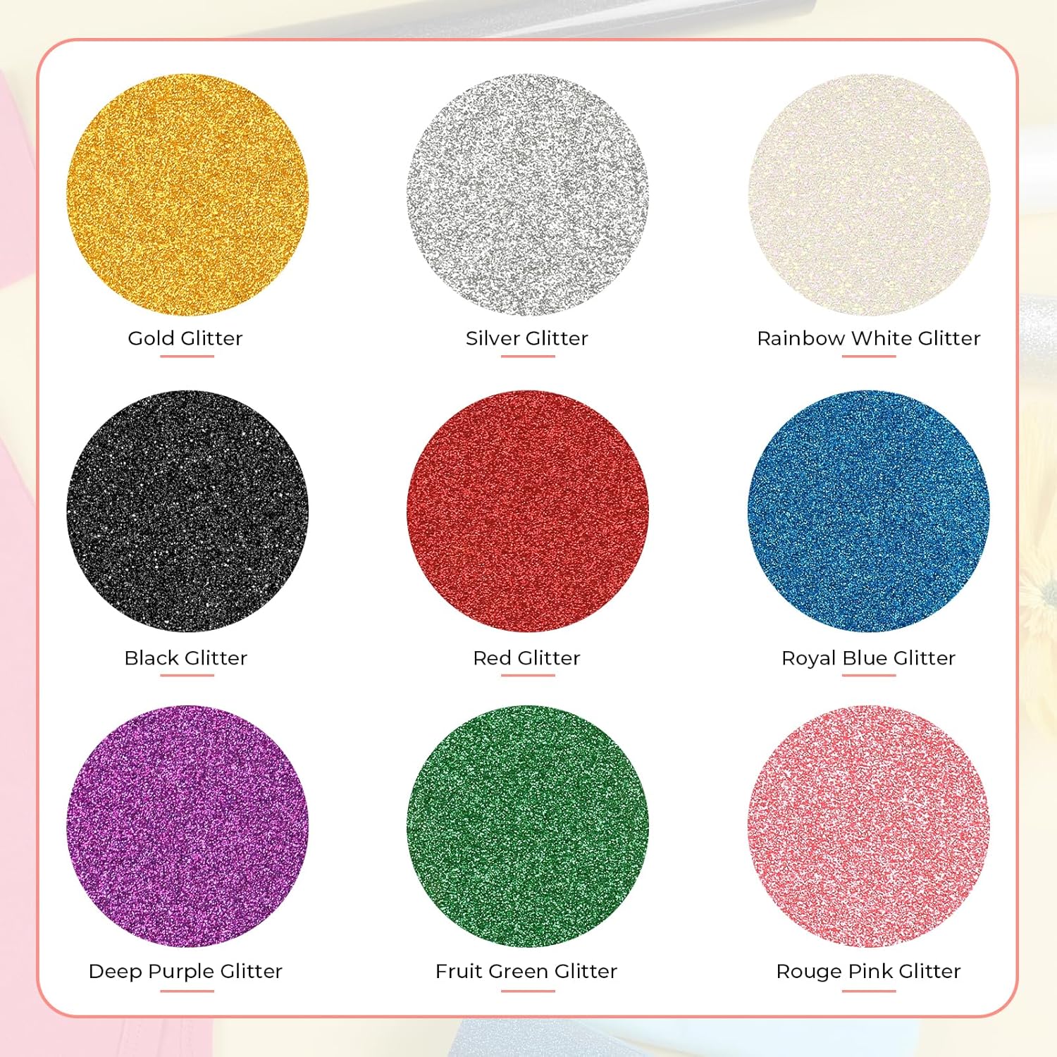 - 【GREAT VALUE Glitter HTV BUNDLE 】Each HTV Heat Transfer Vinyl Bundle includes 9 sheets of High Quality PU glitter HTV vinyl and 1 teflon sheet to complete your iron on/heat press project needs. The PU heat transfer vinyl materials with super elasticity and softness are perfect for decorating children's clothing and accessories. A good choice for Halloween, Christmas and Birthday gift