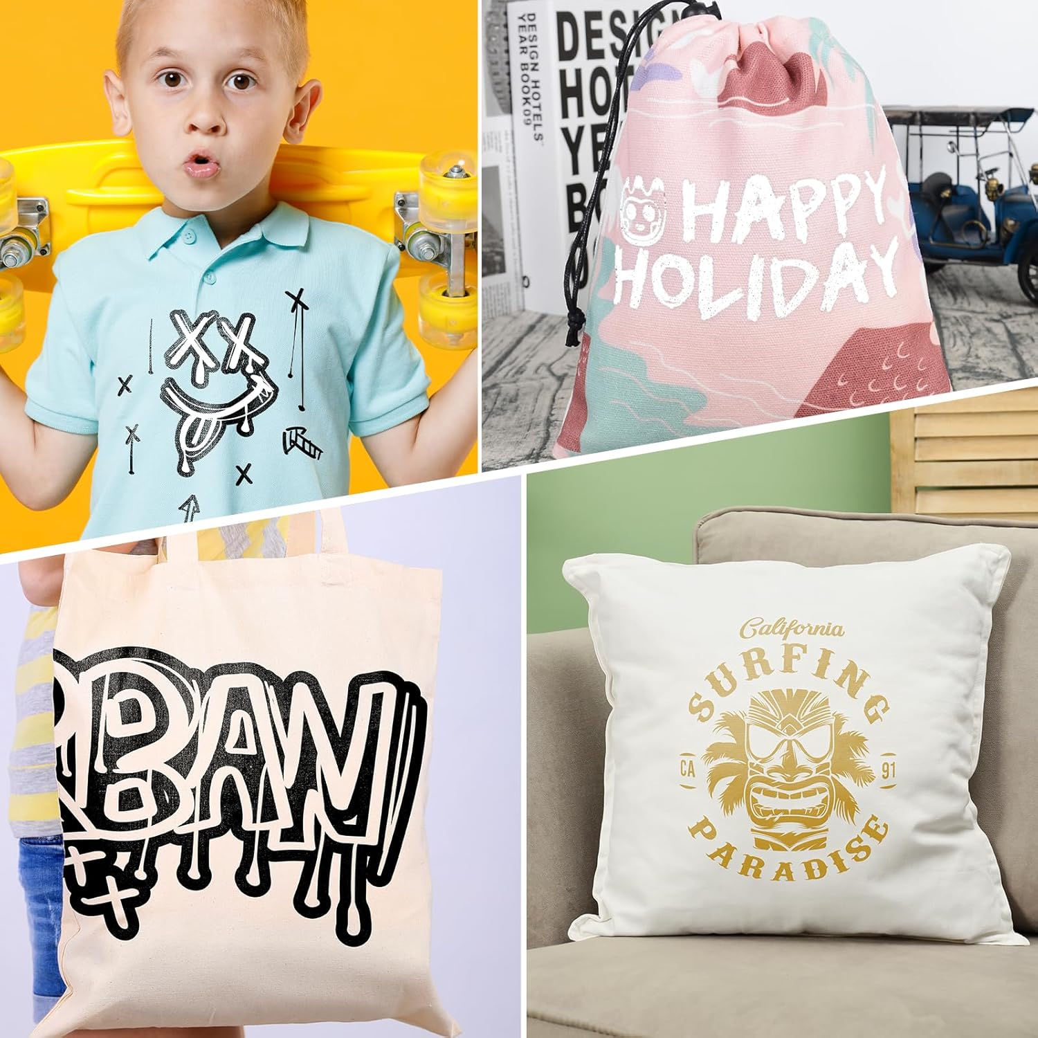 - 【CUSTOMIZABLE & USE WIDELY】12" × 12" pre-cut size White and Black Iron on Vinyl Sheets are suitable for use with most popular cutter machines and cutting mat. Our quality HTV Vinyl Bundle can be used to create stunning projects on a wide variety of fabrics such as including 100% Cotton, Cotton/Polyester Blends and even Athletic Mesh fabrics! Personalize your custom t-shirts, tote bags, caps, aprons, pillows and more with our Vinyl HTV