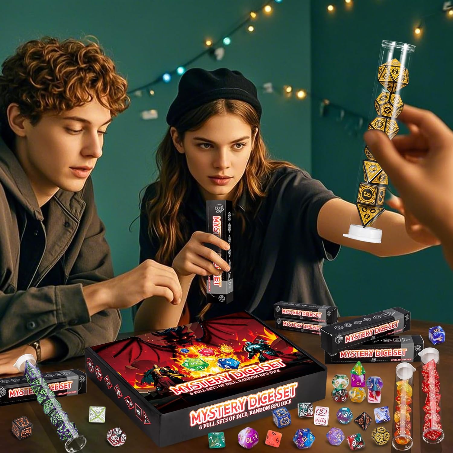 - Surprise Mystery Dice Box: QMAY Mystery Dice has OVER 100 styles dice, you will get random 6 sets (42pcs) of polyhedral dice and 6 dice display tubes. What style of dice will you get? Come on, enjoy the surprise and fun brought to you by QMAY Mystery Dice Gift Box!
