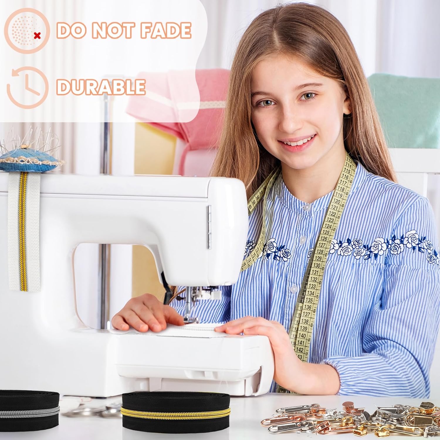 DOITEM 17.8 Yards Endless Zippers by The Meter Black White Zipper 6 mm Spiral + 32 Nonlock Zippers (Gold Silver Rose Gold)