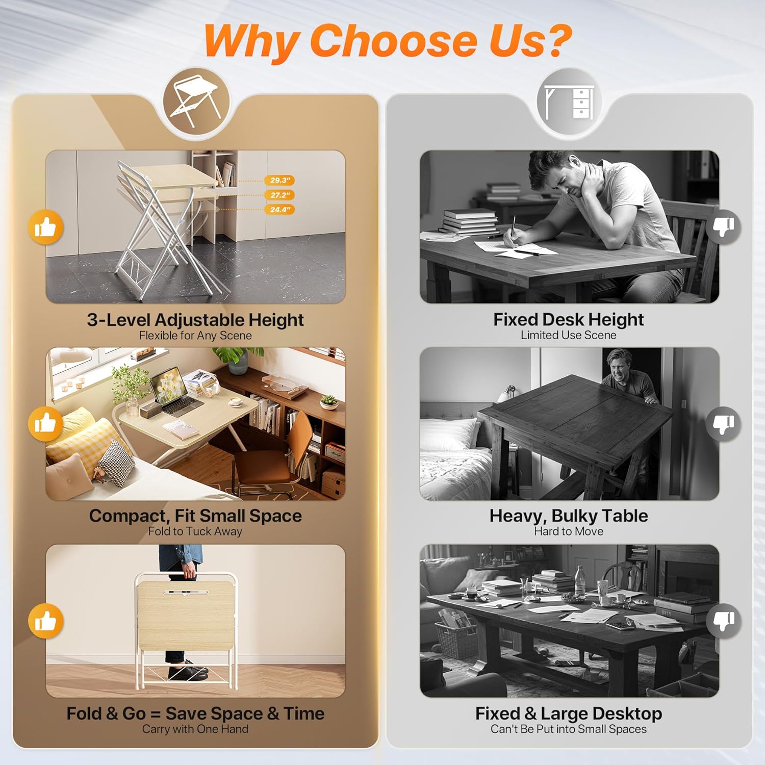 - ăSturdy & Durable BuildăStrong steel frame, adjustable feet, and cross-leg design of the portable folding desk provide exceptional stability. The water-resistant, scratch-resistant tabletop blends seamlessly with any home decor â perfect for bedrooms, apartments, RVs, offices, and more