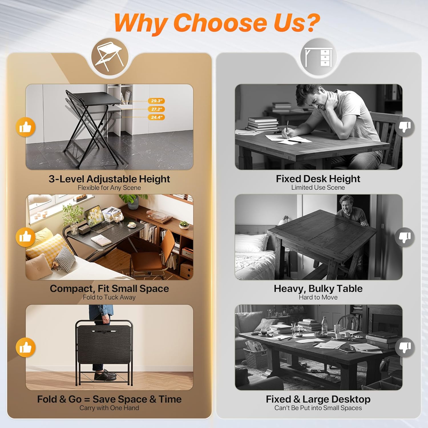 - ăSturdy & Durable BuildăStrong steel frame, adjustable feet, and cross-leg design of the portable folding desk provide exceptional stability. The water-resistant, scratch-resistant tabletop blends seamlessly with any home decor â perfect for bedrooms, apartments, RVs, offices, and more
