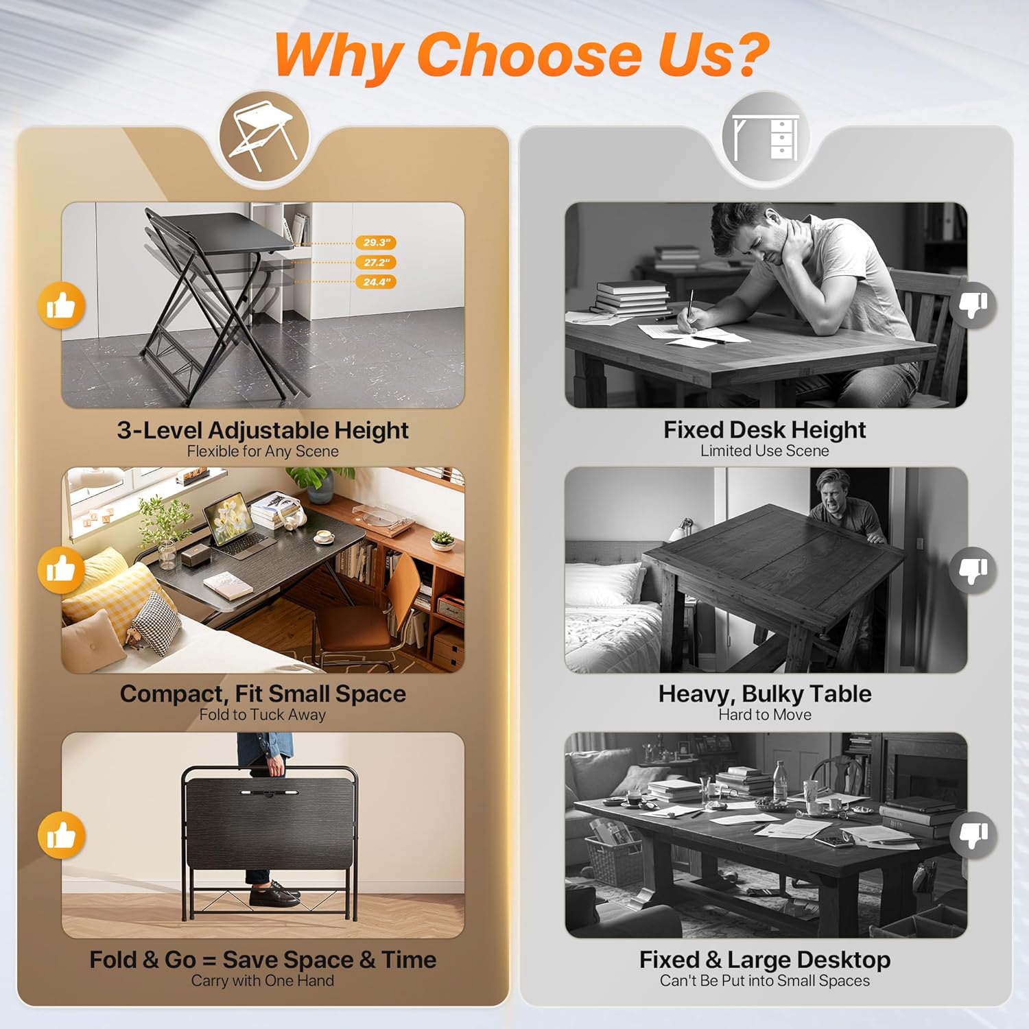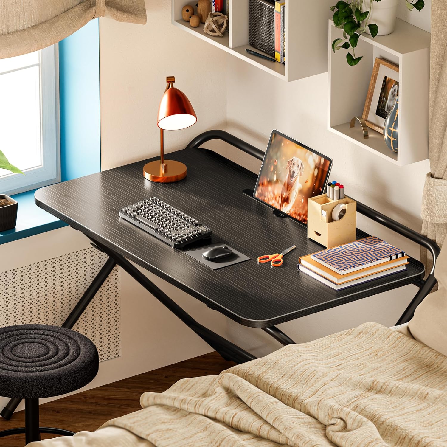 - ăSturdy & Durable BuildăStrong steel frame, adjustable feet, and cross-leg design of the portable folding desk provide exceptional stability. The water-resistant, scratch-resistant tabletop blends seamlessly with any home decor â perfect for bedrooms, apartments, RVs, offices, and more