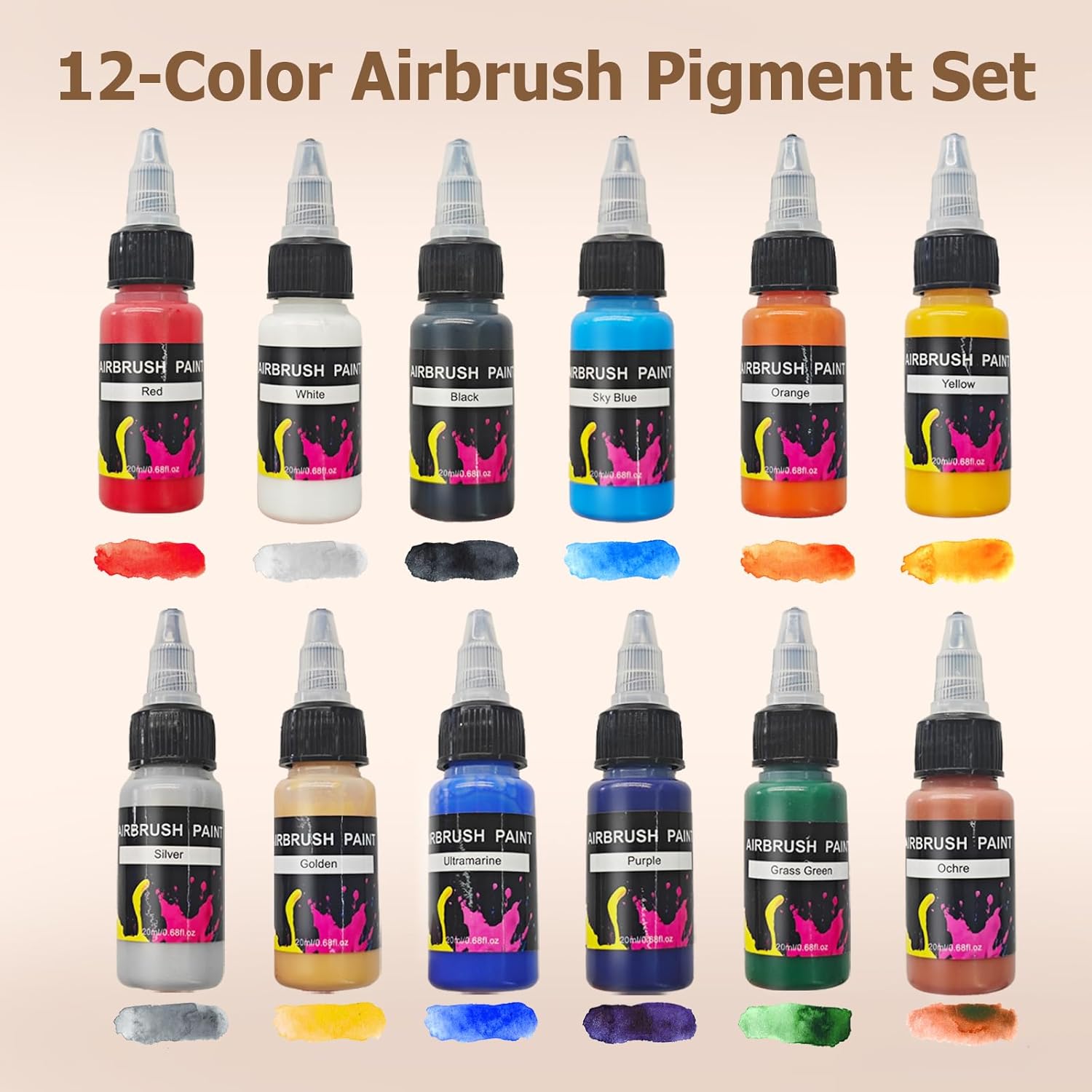 - ALL-IN-ONE PROFESSIONAL KIT – Includes 12 vibrant acrylic paints, a 7-speed airbrush compressor, a dual-action airbrush gun, cleaning kits, and spare parts. Perfect starter set – no extra purchases needed