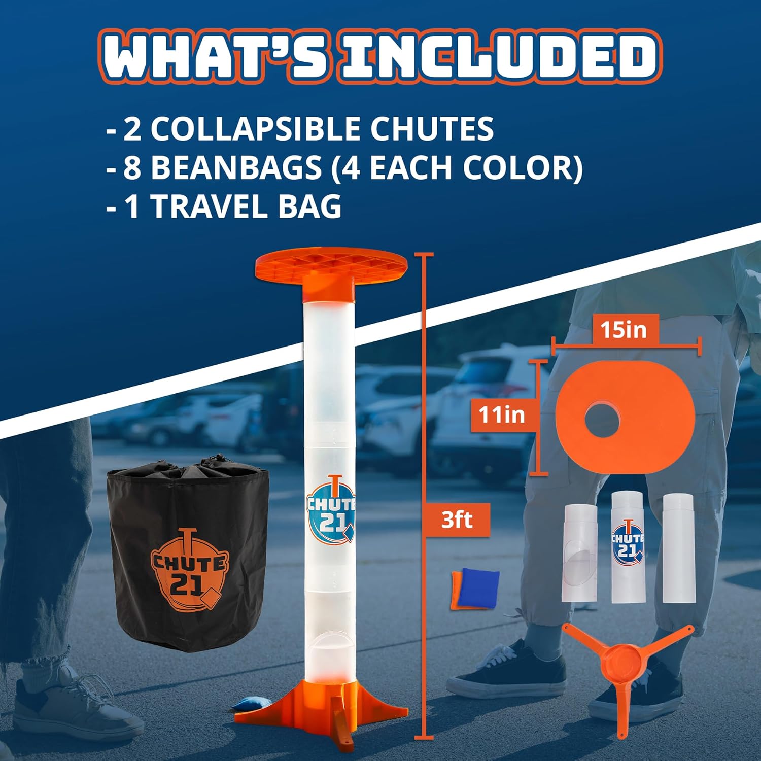 - Easy Setup Portable Game Set – The collapsible design makes Chute 21 easy-to-assemble game effortless to transport and store. This lawn toss game comes with a durable carrying case for convenient travel. Chute 21 is a lightweight compact travel game for families and a delightful gift for a holiday party.