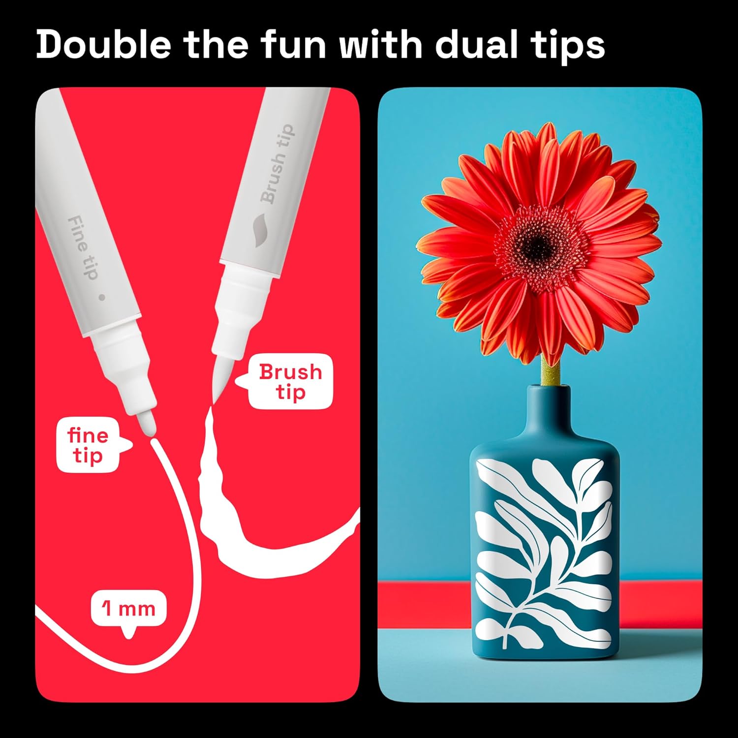 - Dual Tip Design: Each Artistro white acrylic paint marker is equipped with a flexible 1–5 mm brush tip for coloring, shading, and bold strokes, plus a 1 mm fine tip for outlining, lettering, and precise details. Two tips in one pen for maximum versatility.