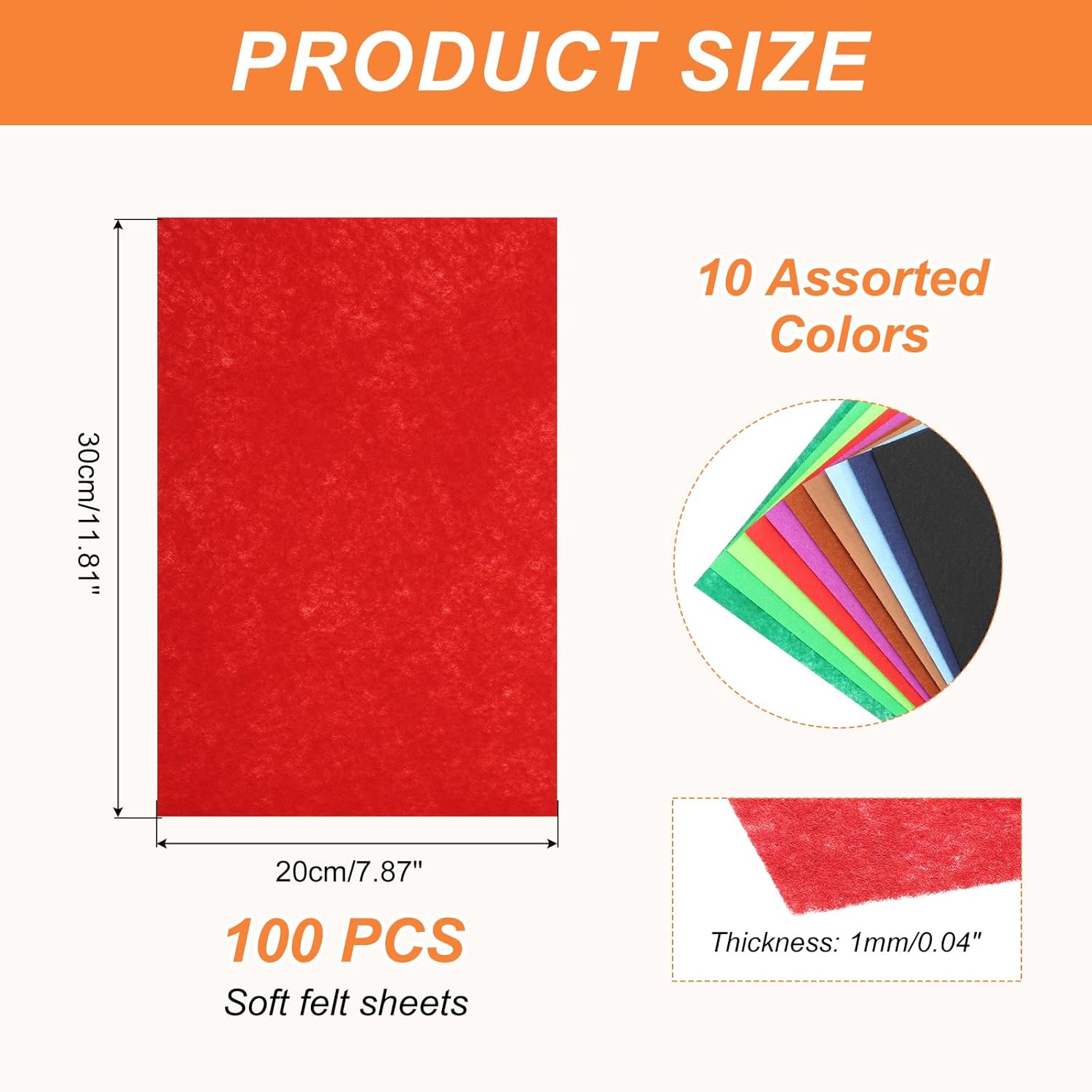- The felt sheets, Size: 20cm x 20cm/7.87 inch x 7.87 inch(L*W); Thickness: 1mm/0.04 inch; Color: 10 Colors;the package of 100 x soft felt sheets.
