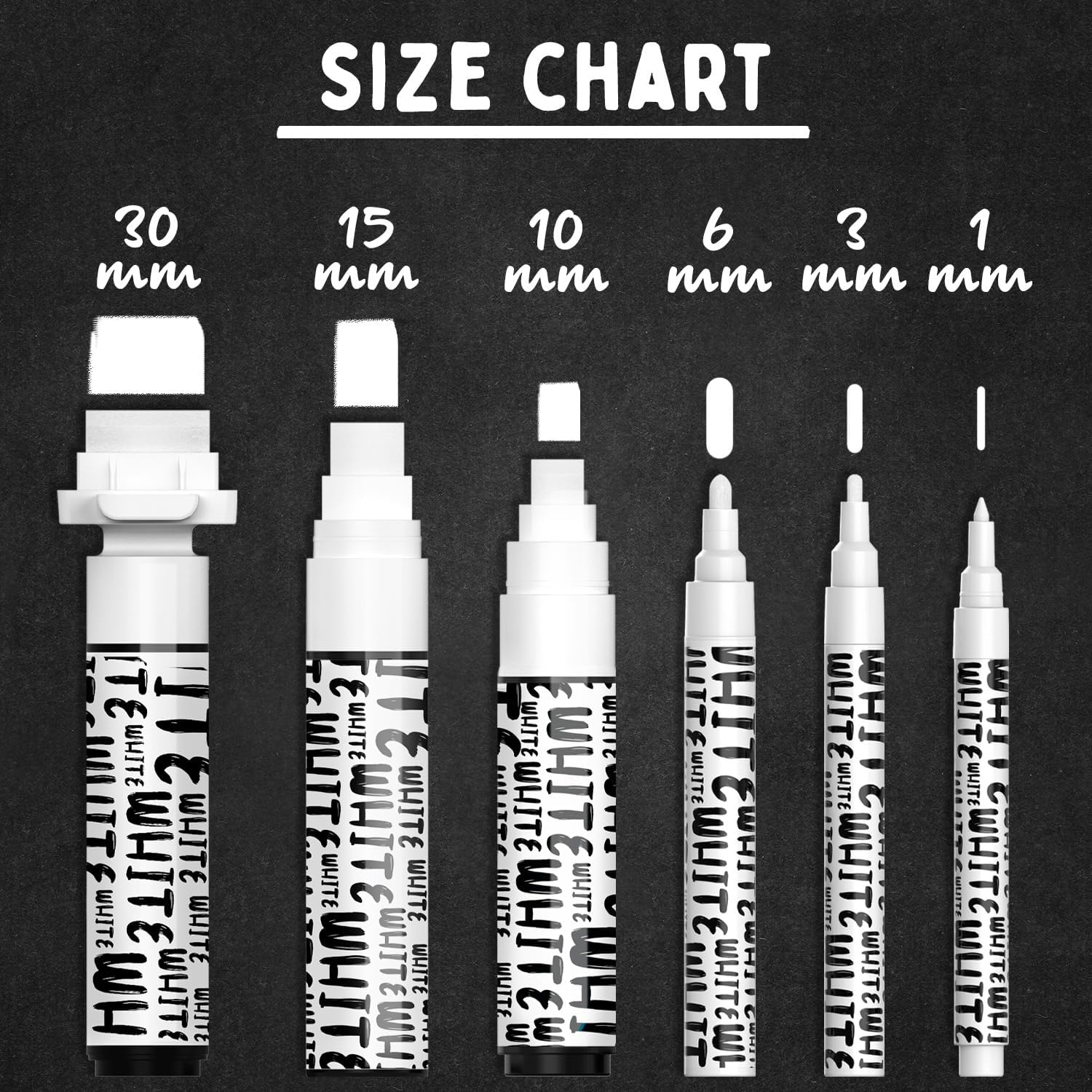 - 1mm | 3mm | 6mm | 10mm |15mm | 30mm - All in one set of White chalk markers fine tip (thin), extra fine point & bold tip (thick) & jumbo 15mm, 30mm - Time to replace the old dusty chalk with white chalk ink marker.
