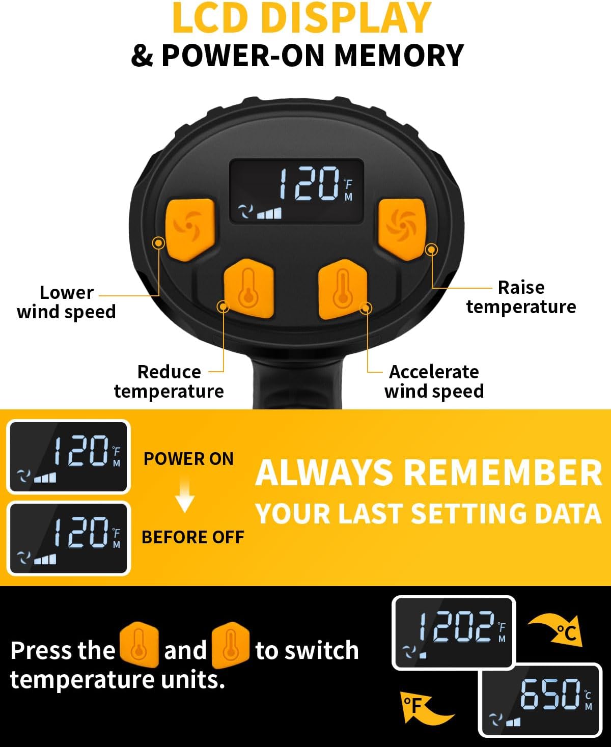 - 【Powerful 1500W & Instant Heat】 Tackle jobs fast with robust 1500W power. Engineered for rapid heating, this heavy-duty gun reaches optimal working temperatures in seconds, maximizing your efficiency and minimizing downtime. Get the heat you need, right when you need it
