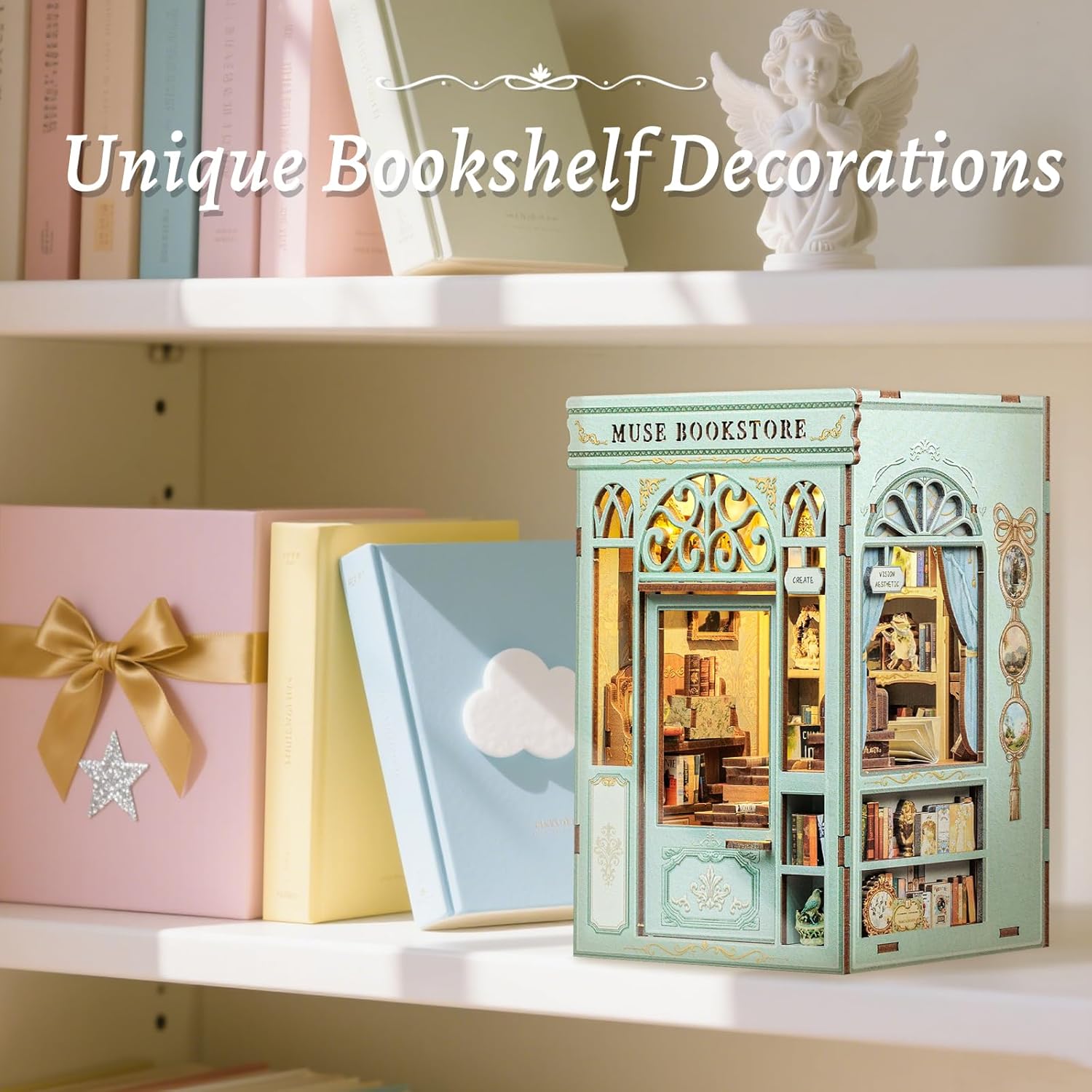 - 【Unique Designed Book Nook Kit - Muse Bookstore 】The 3D puzzle kit is a tiny diorama kit fits between books on a shelf, creating a little scene. The booknook is relate to a bookstore theme, it has LED lights, miniature books and miniature utensils to make the book nook more funny