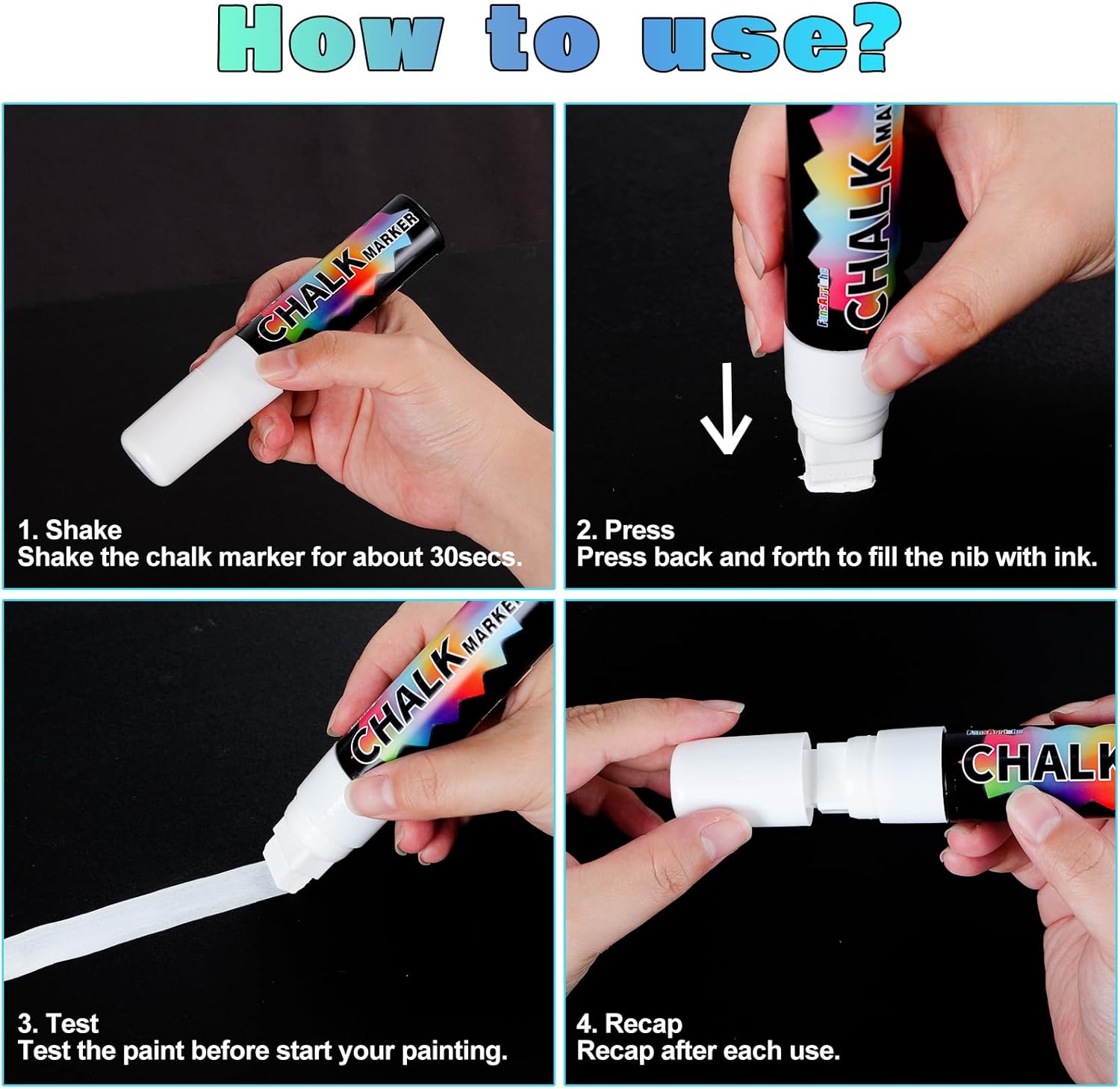 - Bright Vibrant Colors: 4 pack of white jumbo markers. Liquid chalk marker uses newly upgraded inks with more vibrant colors. Add style and get creative for Halloween, Christmas, holiday parties and more.