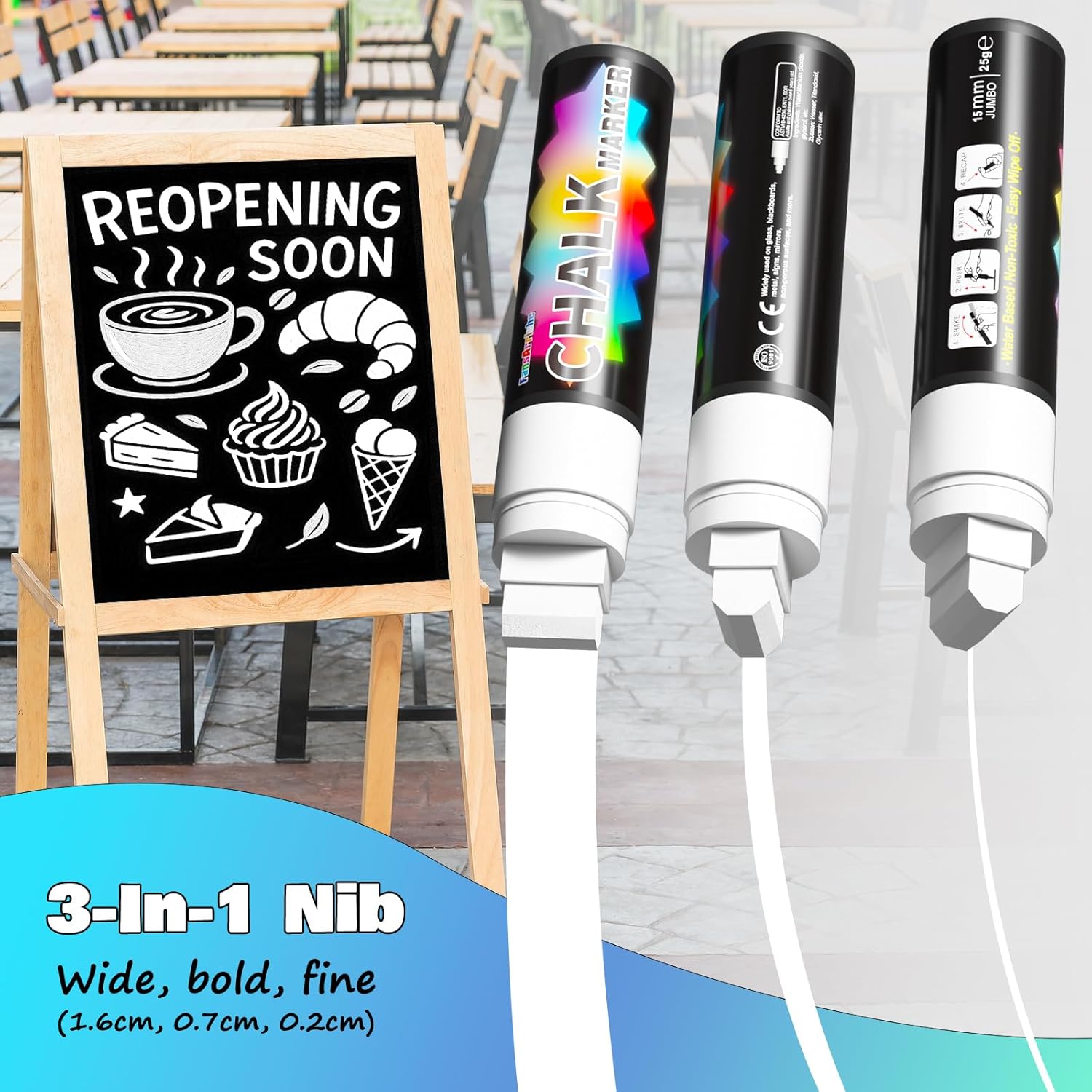 - Multi-Size: Liquid Chalk with a 3-in-1 nib, you can use the rectangular nib to create 3 styles - wide line, thick line, and thin line - for a variety of needs.
