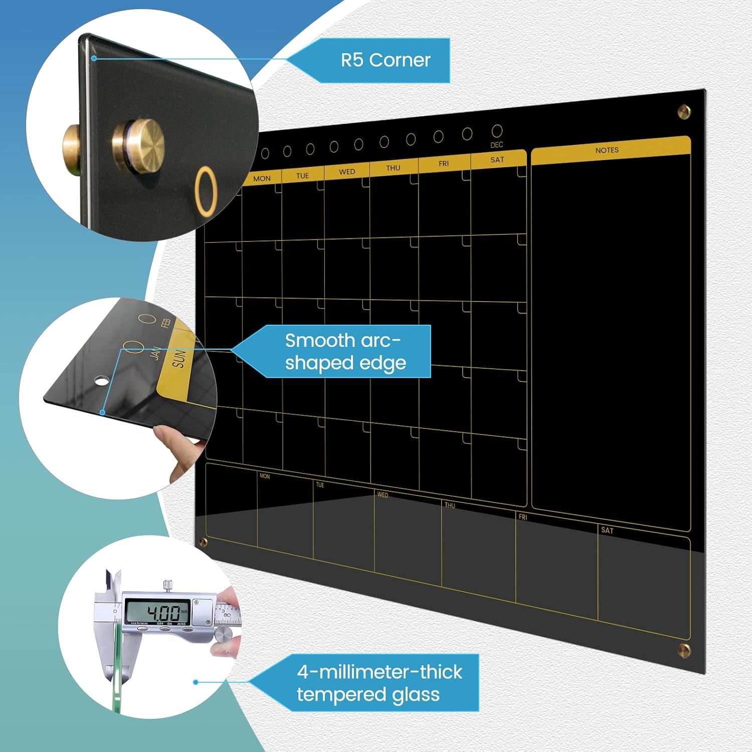 - Plan with Precision:This black glass calender whiteboard can help you organize your work tasks,class schedule or growth goals.Understand monthly and weekly calendars,and extra space on the side for notes and reminders.The glass dry erase calendar makes life more efficient.