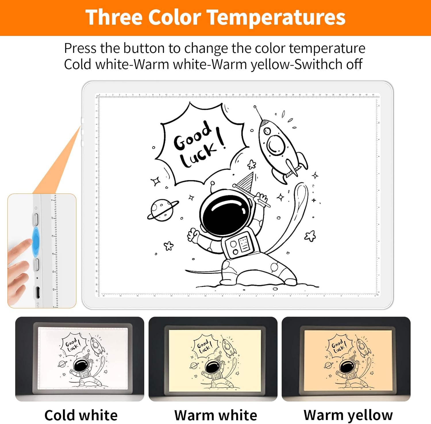 - γ 3 Colors Light and 6 Levels Adjustable Brightness γ This A3 Tracing light box are available in three lighting modes, white color, normal color or warm color, each with choice of 6 adjustable brightness levels.
