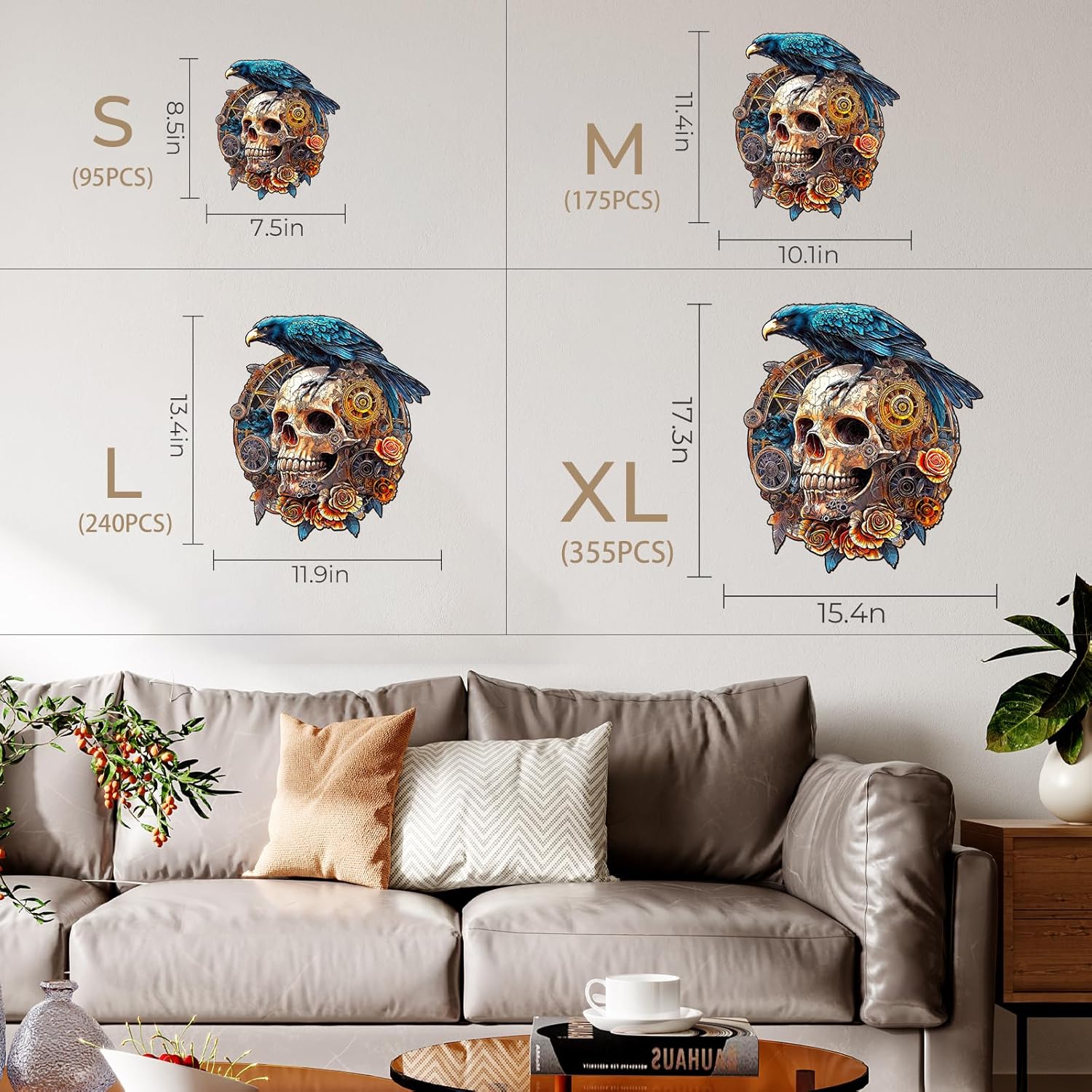 KAAYEE Wooden Puzzles for Adults, 3D Visual Effect Raven & Mechanical Skull Wooden Jigsaw Puzzle Unique Shape Wood Puzzle Adult, 3D Effect Flat Puzzle Birthday Family Games (M-11.4 * 10.1in-175pcs)