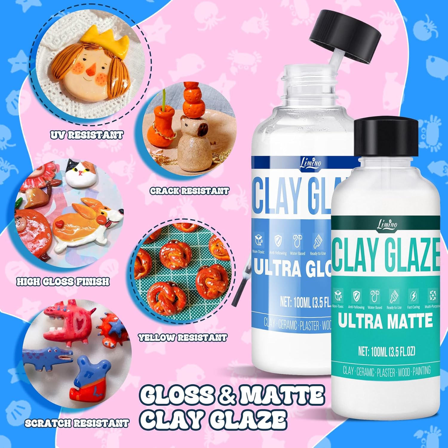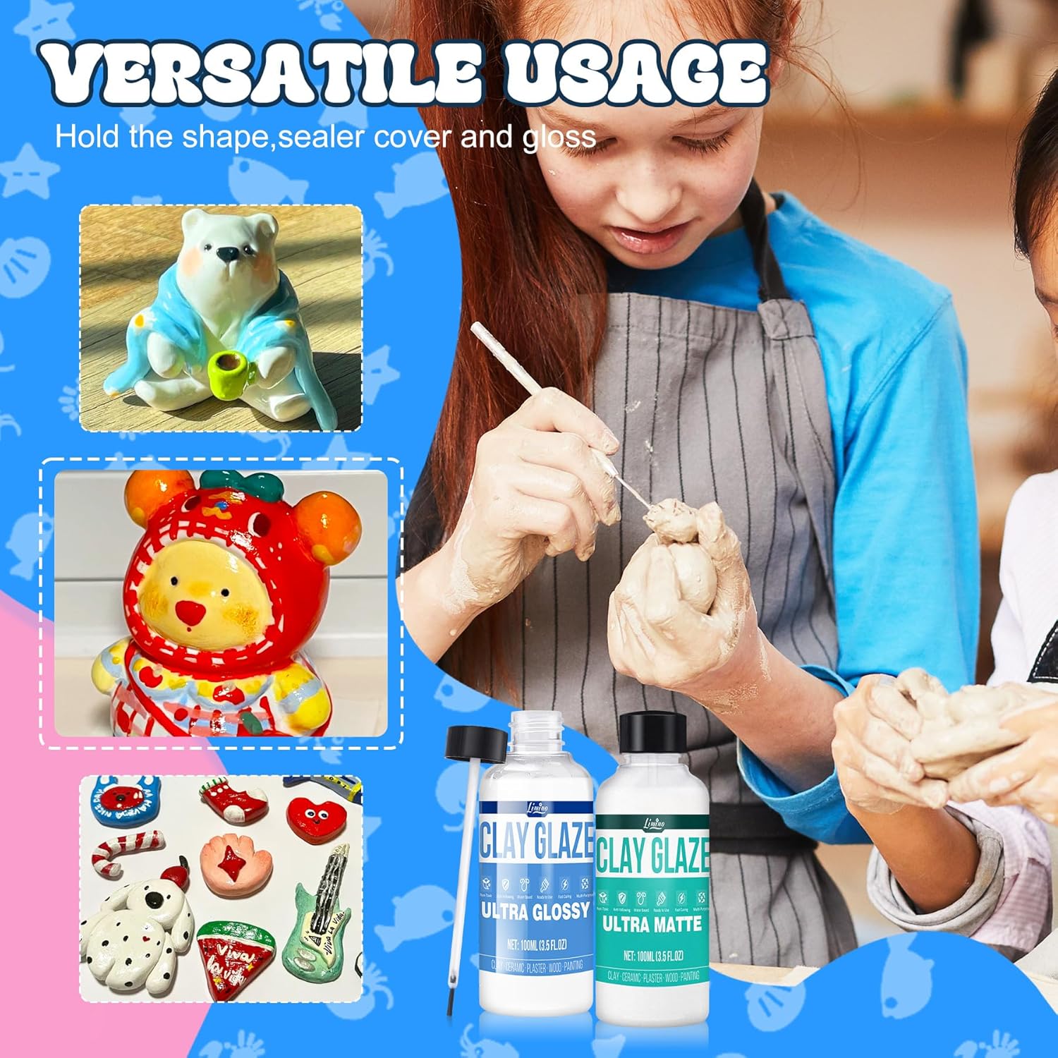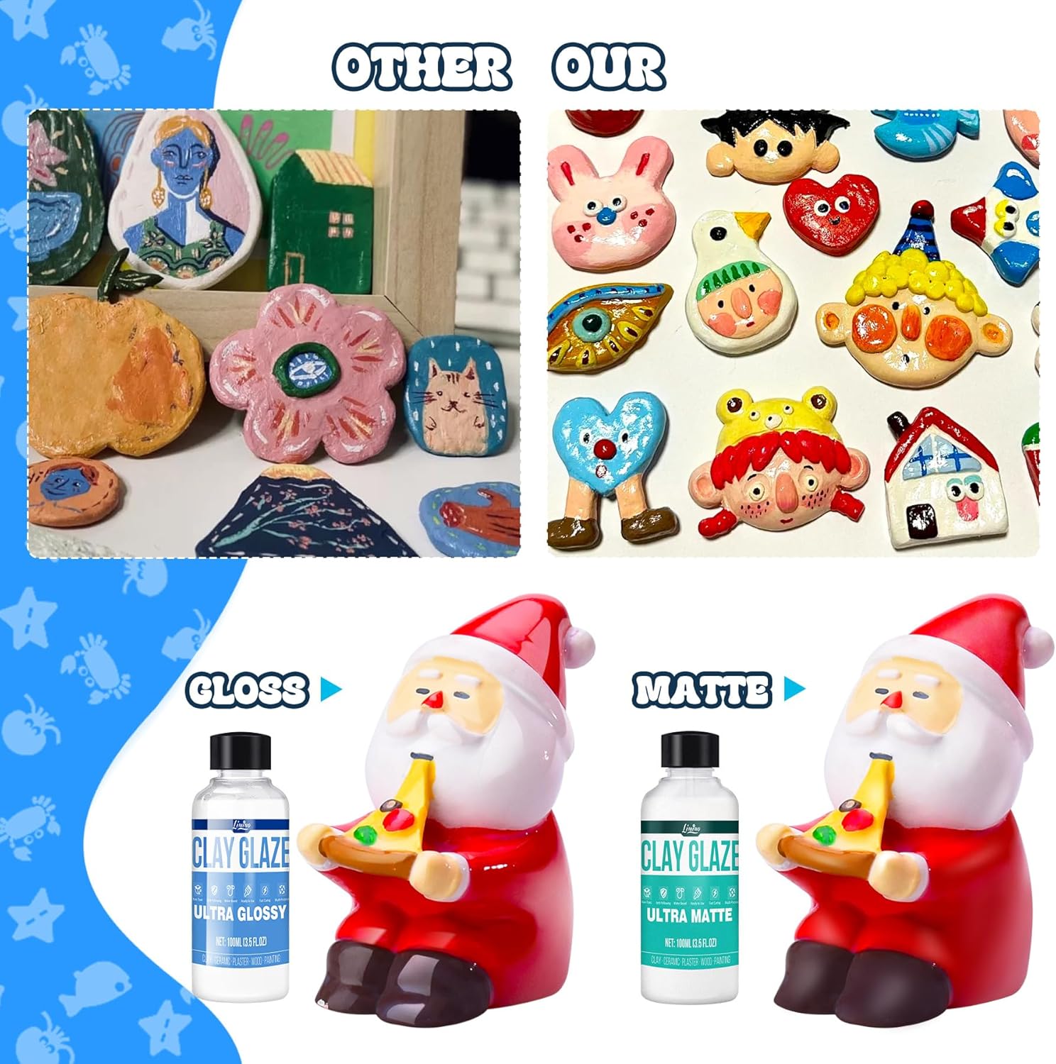 - DURABLE, LONG-LASTING BEAUTY - Our high-gloss air dry clay glaze delivers a brilliant, enduring shine for artworks and ceramics. Our matte clay glaze showcases the most authentic matte texture. It creates a crystal-clear protective film that resists yellowing, preventing scratches and abrasions. This varnish guarantees your creations will shine beautifully while providing durable protection, enhancing the visual appeal of your projects, and two bottles of varnish will meet all your artistic creation needs.