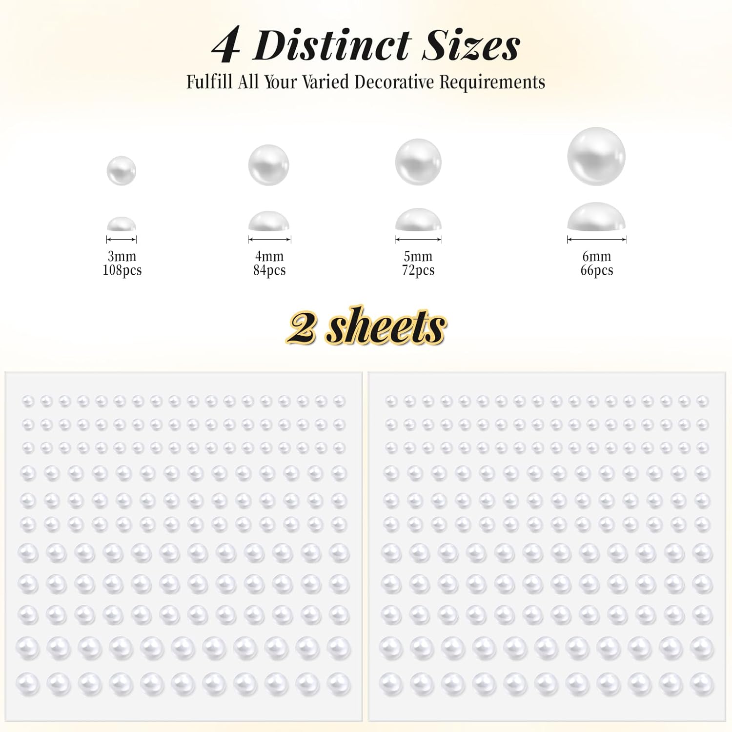 - Multi-size combination:Each sheet comes in four sizes of flat back pearls, 3mm/4mm/5mm/6mm (0.12 inch /0.16 inch /0.2 inch /0.24 inch), the number and size are enough to satisfy you the demand of all kinds of make-up and craft project