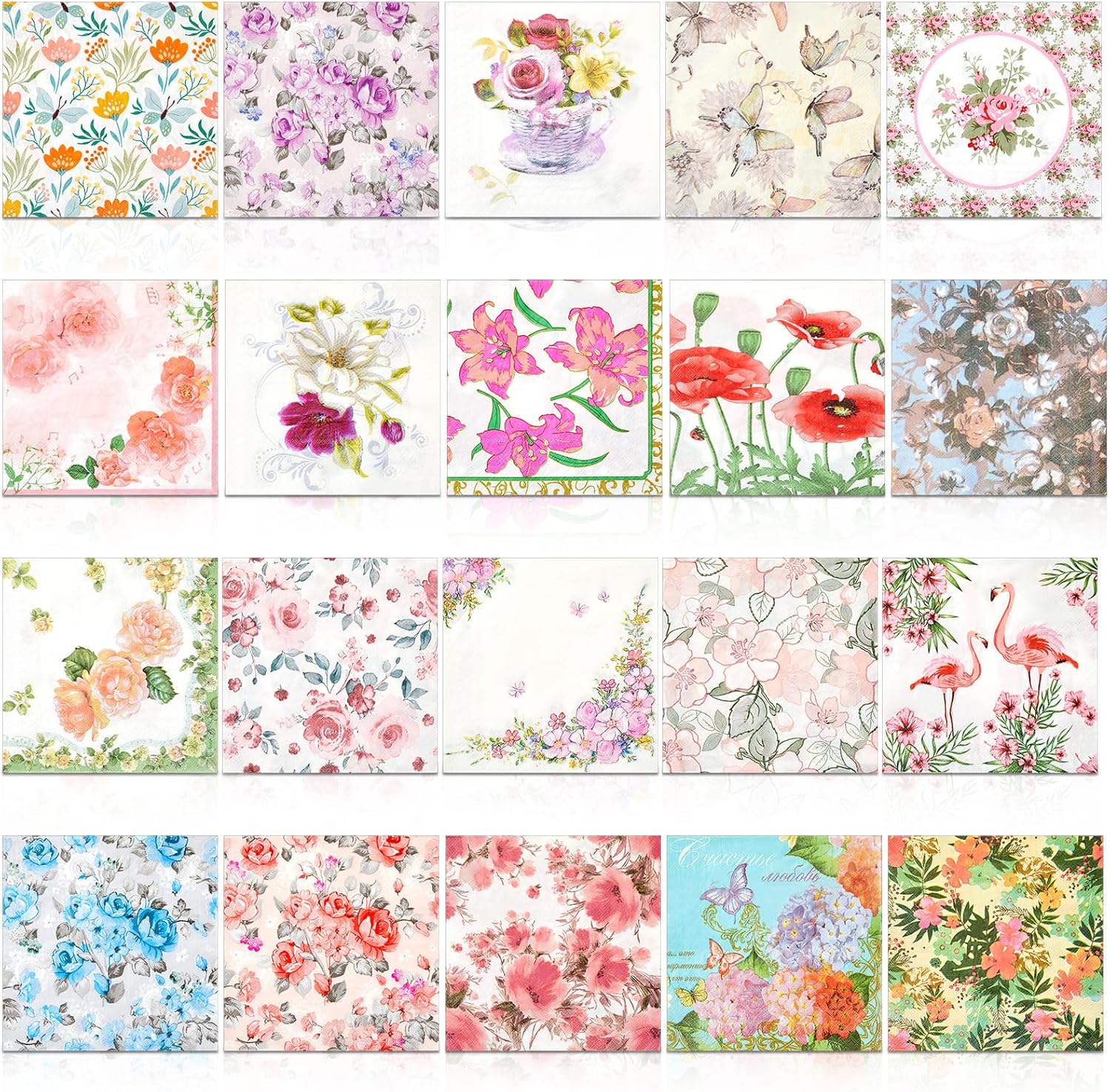 Crtiin 20 Pack Assorted Floral Napkins for Decoupage Toilet Napkins Flower Cocktail Decorative Paper for Birthday Party Beautiful Gorgeous, 20 Styles Each 6.5 inches(Style 3)
