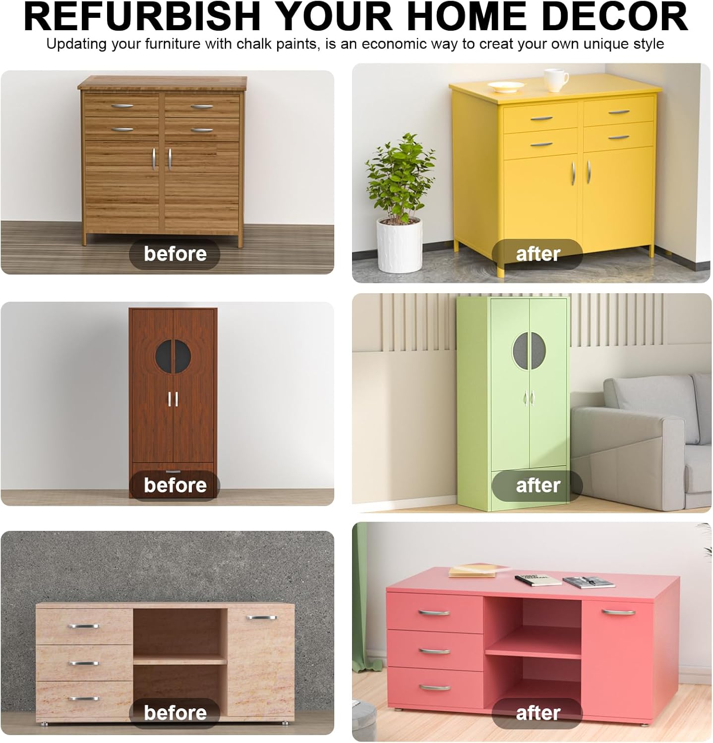 - Low Odor & Non-Toxic: Our chalk paints for furniture is water-based, non-toxic, odorless, safe to used. Can be finished with liquid wax sent to protect the surface and enhance the desired look. The most economical choice for refurbishing old wood furniture for begginer and professionals!